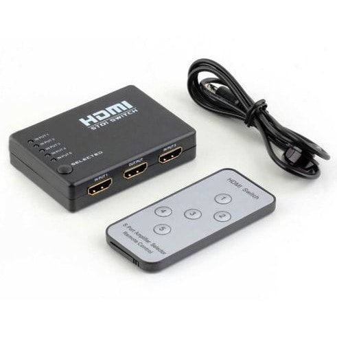 This 5 x 1 switcher provides a way to switch between multiple HDMI signals to a single output. It allows the switching of three inputs and allows the user to easily select from different programme sources without moving cables around. The HDMI switcher can be controlled via front panel push buttons or by the infrared remote control unit that is included. HDTV resolutions of 480p, 720p, 1080i and 1080p are supported.