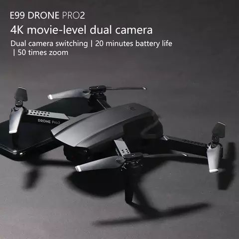 Features:- E99 foldable drone Pro 2 with remote control- Take high-quality images thanks to 4K HD dual camera- Intelligent altitude hold for additional stability- Plan your fly path thanks to trajectory flight mode- WiFi smartphone control and real-time image return- Take photos or videos with gestures- High brightness front navigation light- Have fun using the 3D rollover function