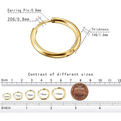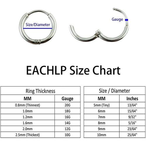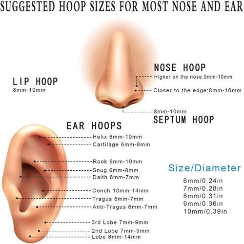 - Gauge size:20G/0.8mm,Dia 6mm/0.23‘'Inch,8mm/ 0.32''Inch,10mm/0.39Inch,lightweight. They can be used as Nose rings, Helix earrrings ,Forward helix earrings,Septum ring ,Daith earrings, Lobe earrings, Lip rings ,Tragus earrings, Belly button rings,Nipple ring,Snug earrings,Anti-tragus earrings,Upper lobe earrings,standard lobe,transverse lobe and Rook earrings body piercing hoop ring,These earrings are an addition to your fine or fashion jewelry collection