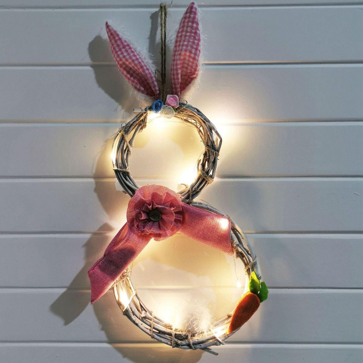 Detailed Information About The Product:Exquisite handmade design: This Easter wreath is made of high-quality, and harmless polyester. With additional LED light string (without battery). Exquisite string lights can add a festive atmospheres to your party.
