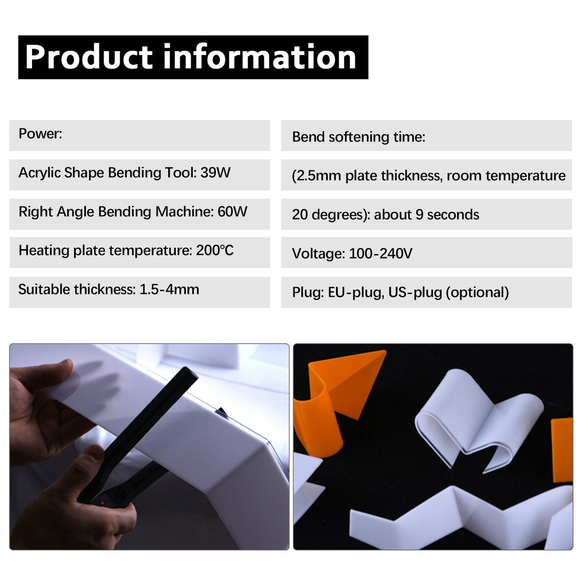 This product is based on the previous g-eneration of hot bending tools, and it has been innovated and upgraded with PTC heating c-omponents to ensure safety, fine heating efficiency with less energy consumption, faster heating-up, longer service time. The heating temperature is automatically controlled, saving the trouble of turning any thermostats, thus very easy to use. The heat-conduction panels guarantee even and stable heating for the materials processed, ensuring the proper contact between the materials and the heating plates.