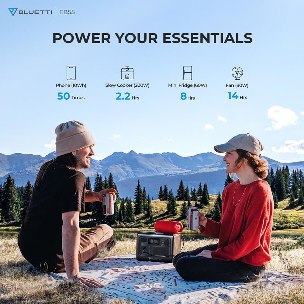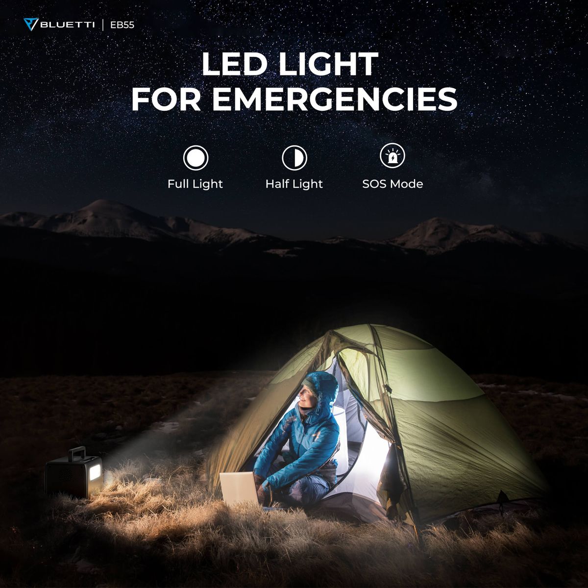 To improve the charging efficiency, EB55 supports AC+Solar charging and dual AC charging, you can reach an input of 400W and get your EB55 fully charged in around 2 hours. It can connect with any solar panel that the Open Circuit Voltage is between 12-28V.