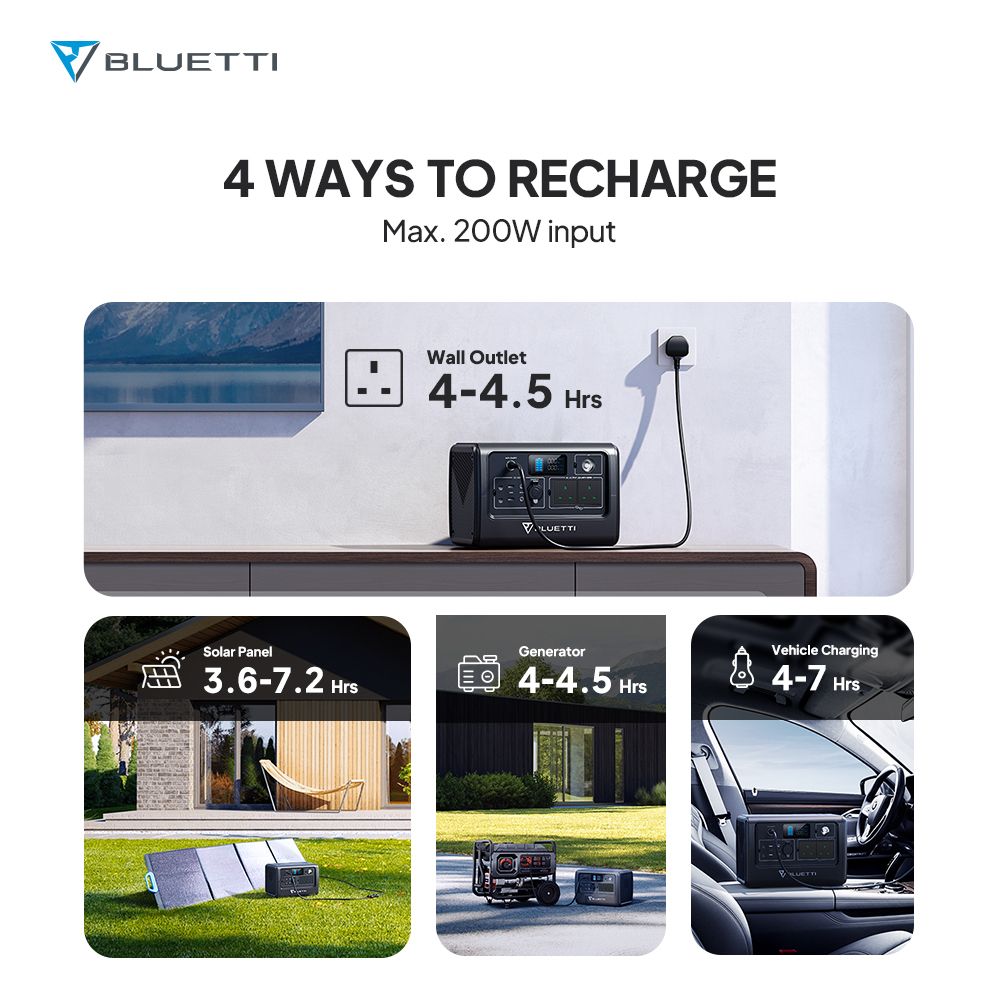 With Max. AC input of 200W, EB70 can be fully charged by wall socket or generator in 4-4.5 hours. EB70 takes up to 200W solar input, and you can fill it up in 3.6-7.2 hours. When it comes to car charging, 4-7 hours are needed.