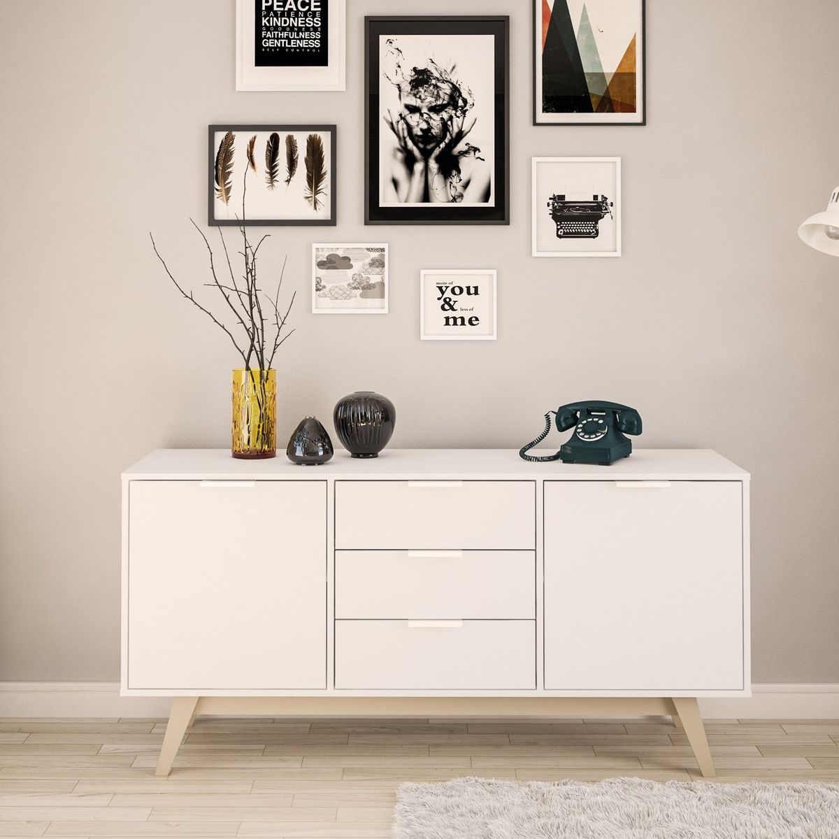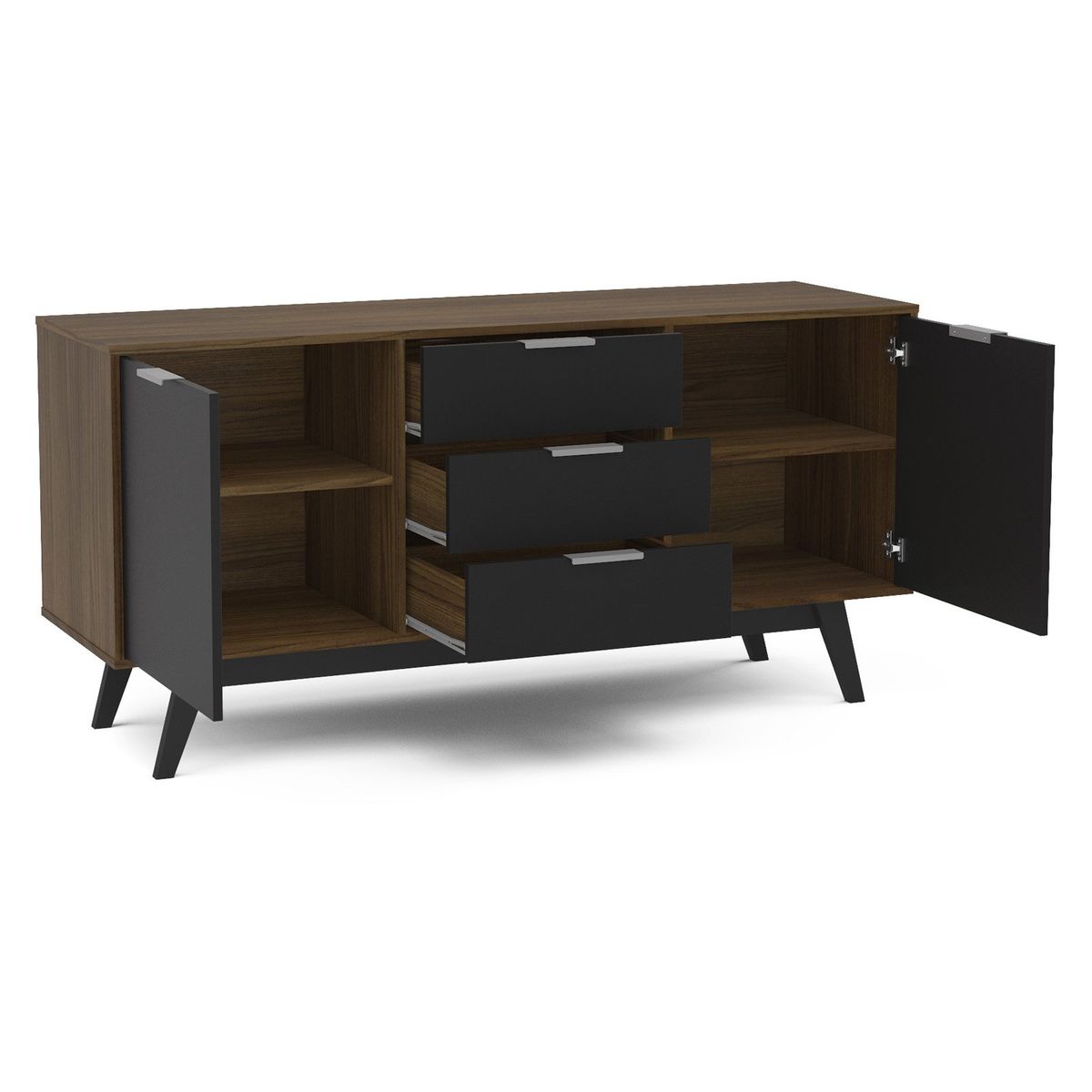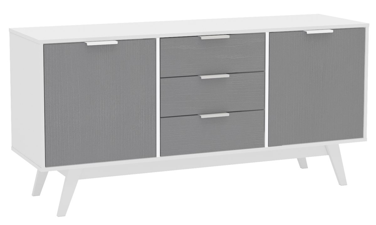 Update the look of your home with the modern design of this Sideboard from Handy. This sideboard is constructed from engineered wood with a durable melamine finish to protect against everyday use. It has wooden legs, modern aluminum handles and is available in multiple color options. There is plenty of storage space to keep your home looking neat and organized. There are two spacious cabinets each with a shelf as well as 3 storage drawers. Pairs perfectly with the matching Shard TV stand.