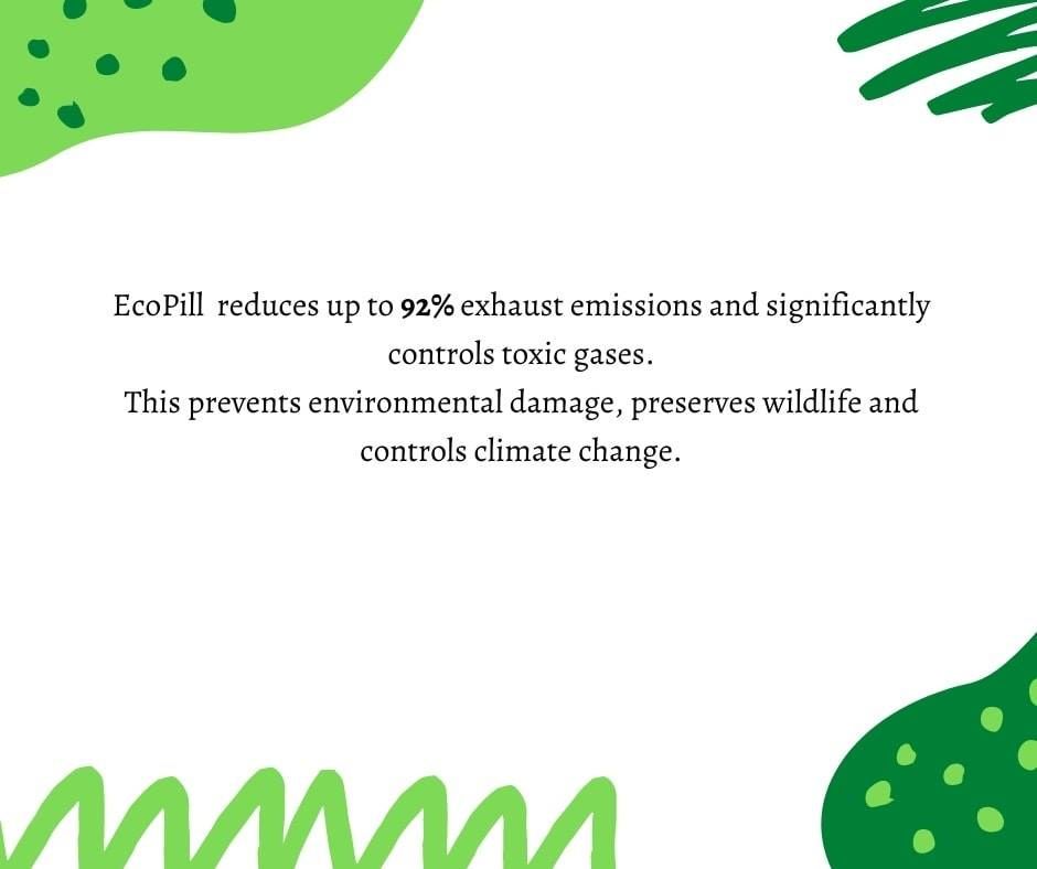 EcoPills help achieves better combustion and thus less workover on your engine. Less workover means fewer repairs and breakdowns in the future. All this will result in less expenditure on Gas and engine maintenance.EcoPills save your money by allowing you to fill up with Gas less often and by protecting and increasing the efficiency of your engine. Greater combustion and more efficiency mean less wear on your engine. Less wear will mean fewer repairs and breakdowns in the future, which will save you big sum of money.Benefits