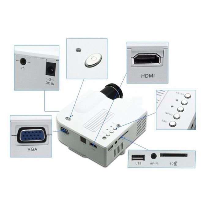 Connections: 1 x HDMI, 1 x VGA (PC), 1 x AV input, 1 x audio output, 1 x SD card, 1 x USB input (built-in media player), 1 x Power
