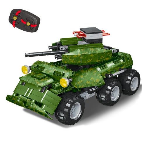 The 2-in-1 radio-controlled military vehicle "Military equipment" is a set consisting of a frame with wheels, 587 parts, a control panel, a USB cable and a rechargeable Lithium battery.