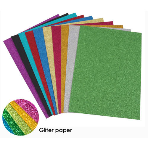 QUALITY GLITTER CRAFT PAPER FOR YOUR ARTS AND CRAFTS. 10 DIFFERENT BRIGHT COLORS(PURPLE, BLACK, LIGHT BLUE, RED, DARKBLUE,YELLOW,PINK, GOLD, SILVER, GREEN). A4 SIZE (300 X 210MM). THICKNESS OF 160GSM.