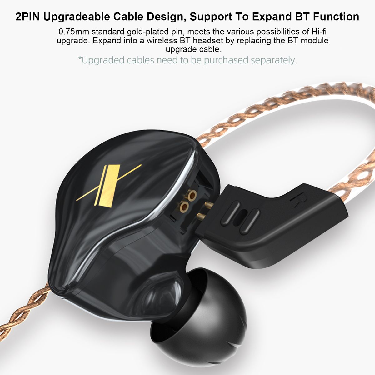 [2PIN Removable Cable] 0.75mm standard gold-plated pin, meets the various possibilities of Hi-fi upgrade. Removable cable design can expand the earphone into a BT headset by replacing the cable (not included).