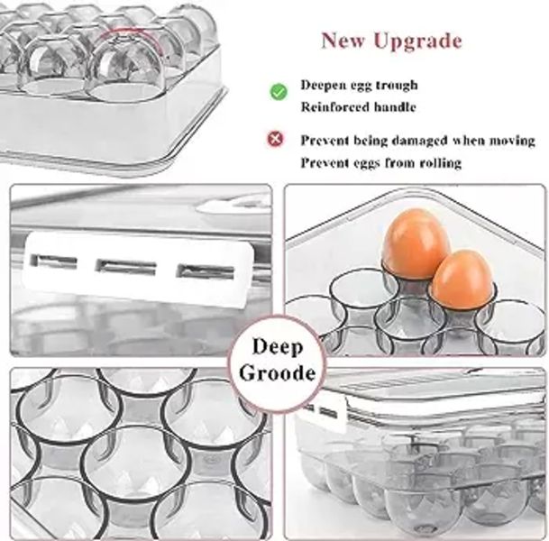 This egg storage container is made of food grade highly transparent material (PET) that allows you to view the remaining egg. The top chronograph is usef to record the date when the eggs are stored to ensure freshness of the eggs. Each tray comes with a four-sided snap detectable sturdy cover.Our egg container can fits 18 eggs in individual compartment, the lid with hole can ventilate and deodorise to keep the eggs fresh for a longer time. The container is robust and durablewith a stacked lid, it helps to save Refrigerator space and bid messy farewell. Egg can delay deterioration in a