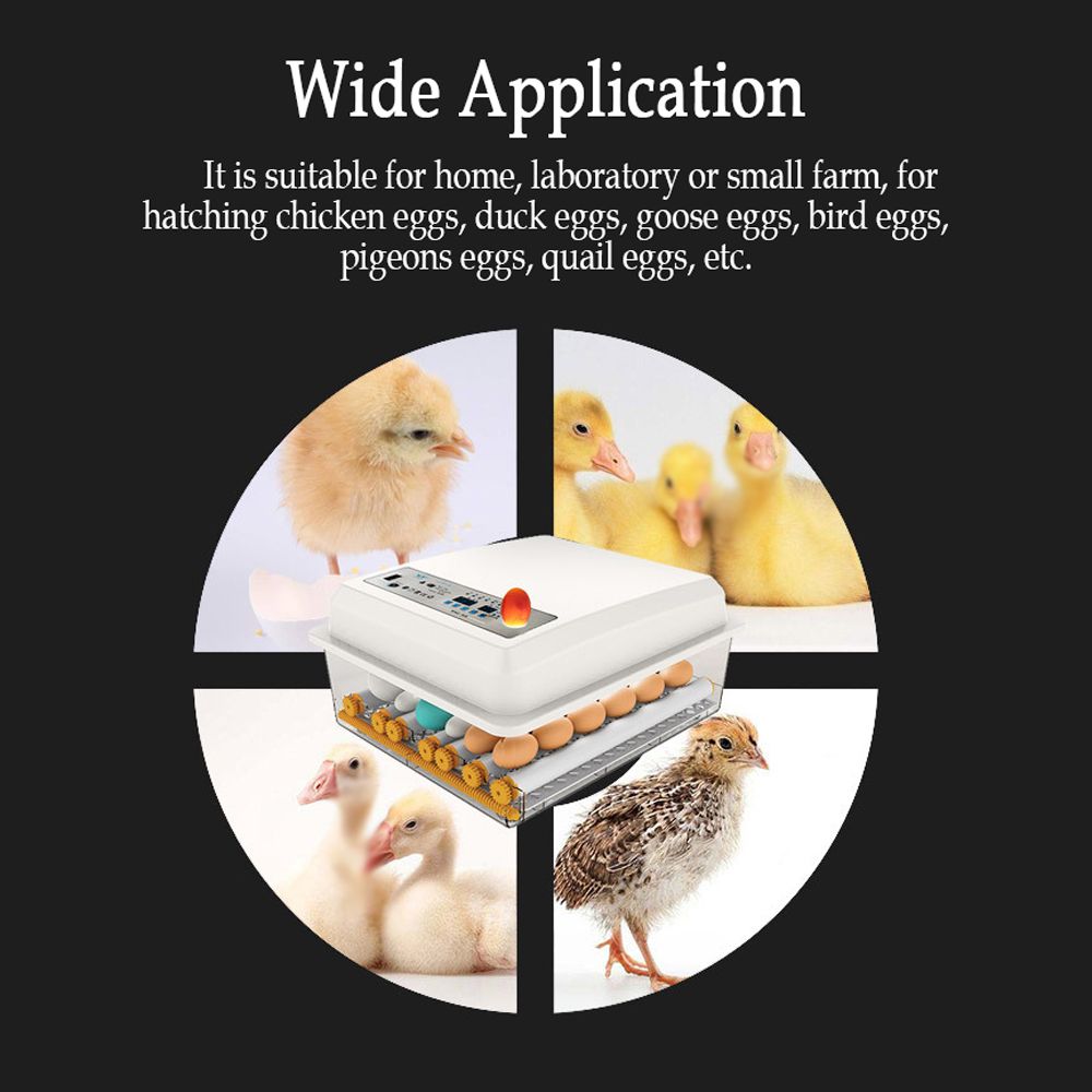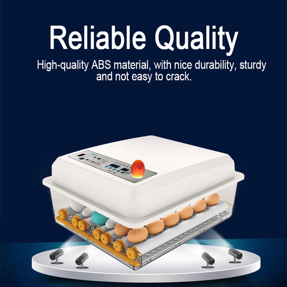 Intelligent eggs incubator, support 110V/12V dual supplys, to ensure continuous , do not worry about failure and affect the incubation. Automatic temperature control, the oblique angle air guide makes the airflow in the machine circulate without blowing directly on the breeding eggs, so the temperature difference is smaller; large fan with strong wind force and better temperature equalization effect. Reliable and guaranteed quality, adjustable internal axis-distance, hatches all kinds and sizes of breeding eggs, such as chicken eggs, duck eggs, goose eggs, bird eggs, quail eggs, etc., suitable for home, laboratories, small farms, etc.