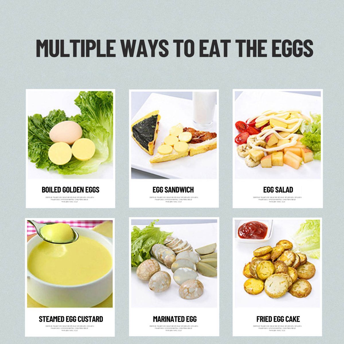 Multiple Eats: Boiled golden eggs, egg-sandwich, egg-salad, steamed egg-custard, marinated-egg, fried egg-cake, etc.