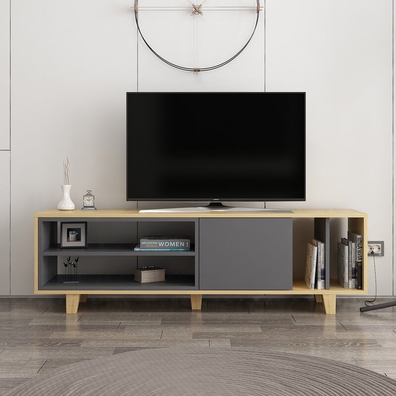 This modern TV stand gives you a convenient spot for your flatscreen and favorite accent pieces. It showcases a clean-lined rectangular silhouette and short tapered legs that freshen up the look of your living room or bedroom. This piece is made from engineered wood, and it comes with a two-toned hue that works well .