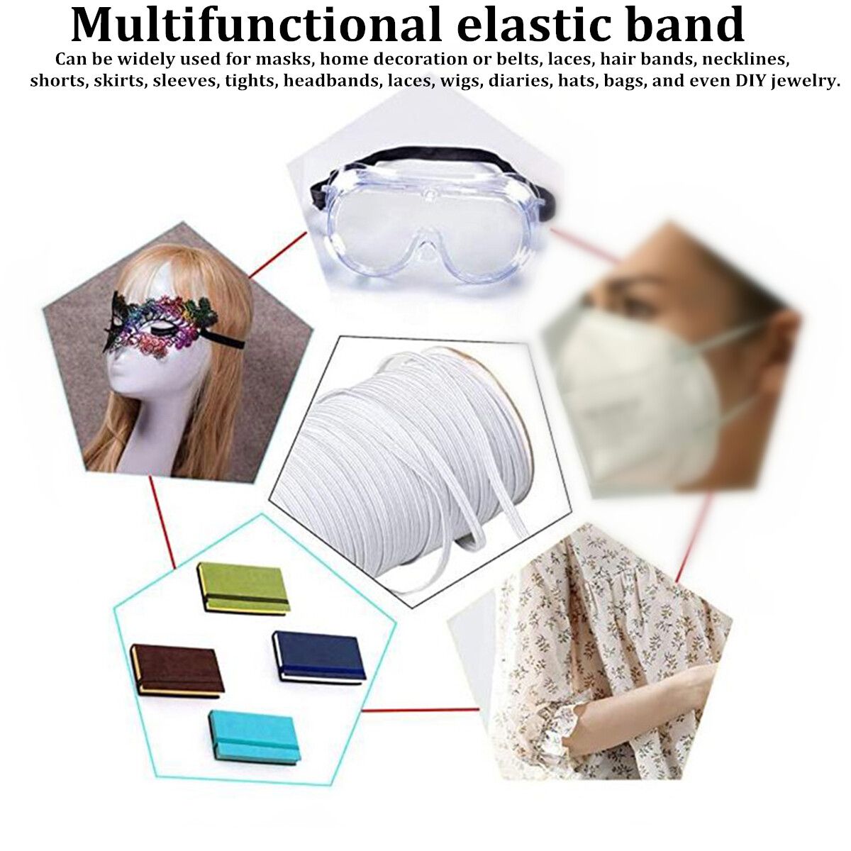 Features:Made of polyester material which makes it more durable and practical, with good flexibility. It is great for sewing and knitting.The elastic band is very convenient to use and store, which organized with a roll spool. You are free to use and cut the elastic string length.The elastic band can be widely used for masks, home decoration or belts, laces, hair bands, necklines, shorts, skirts, sleeves, tights, headbands, laces, wigs, diaries, hats, bags, and even DIY jewelry.