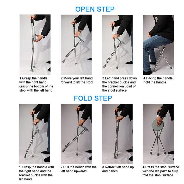 - 2-in-1 Function: Works as a seat to rest when opened, and as a cane when closed.