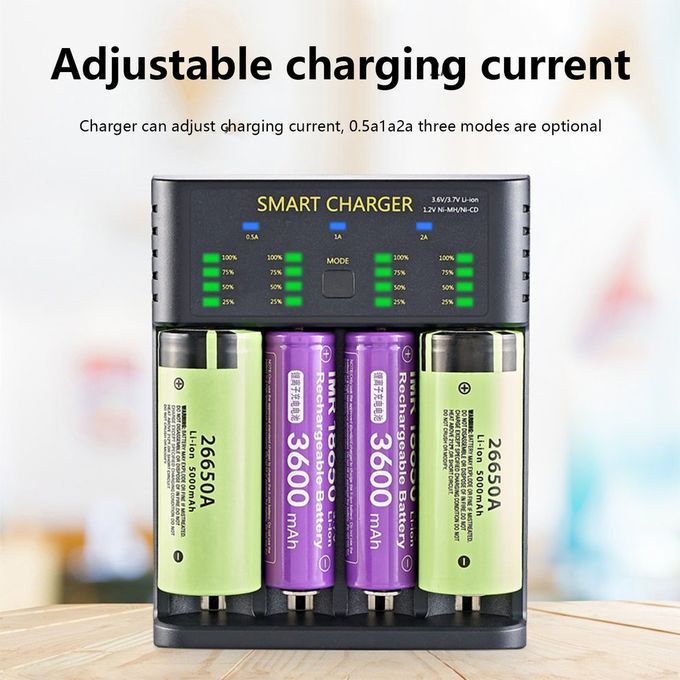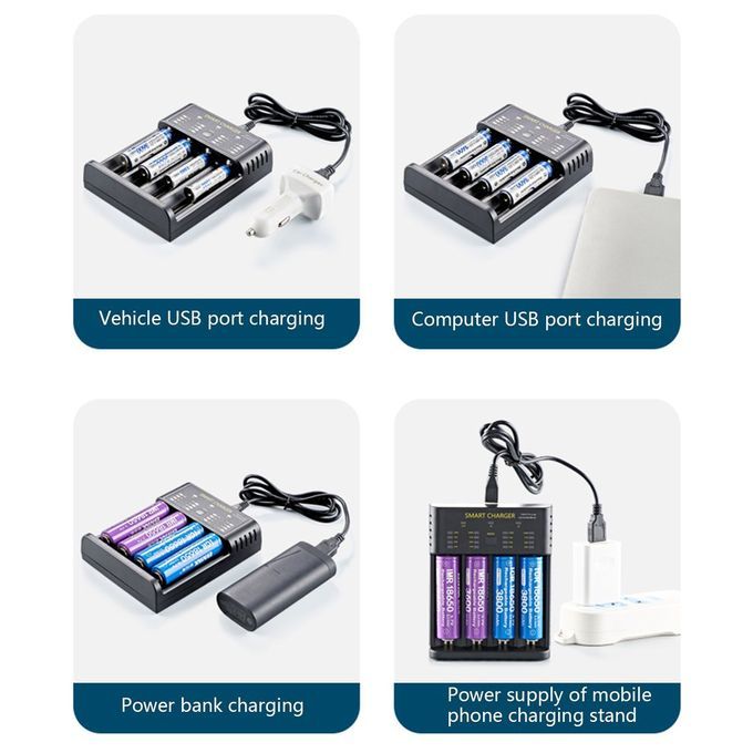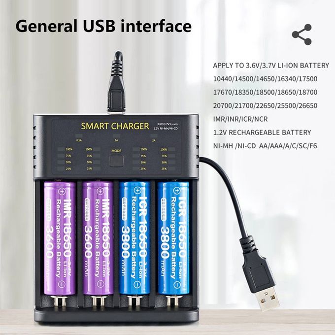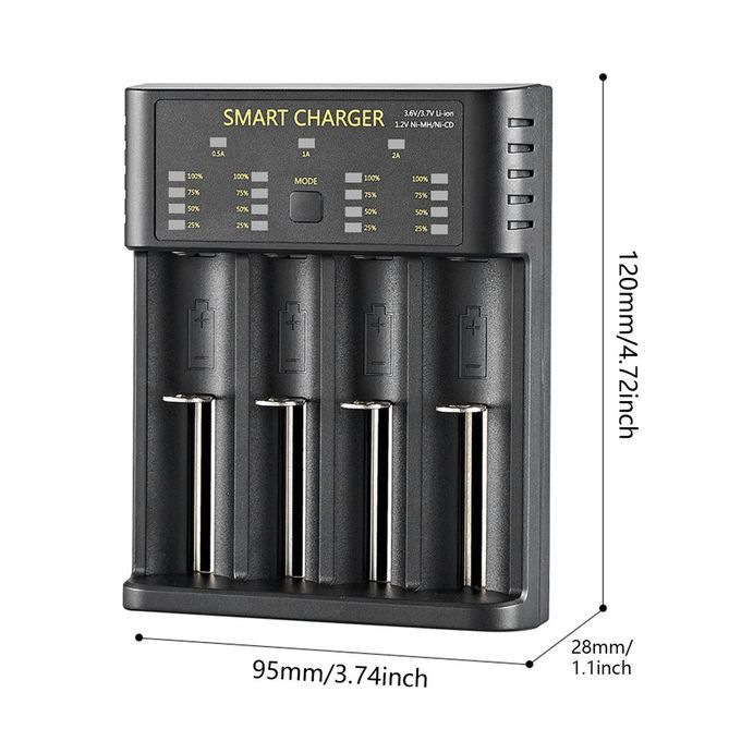 Spe ifi ations Produ t name: Smart four-slot USB harger Produ t model: M04 Input s: 5V 2A Output urrent: 4.2V 0.5Ax4 4.2V 1A x2 4.2V 2A x1 1.45V 0.5Ax4 ompatible battery: 3.6V/3.7V Li-ion battery 10400/14 0/146 /16340/17 0 17670/183 /18 0/186 /18700 20700/21700/226 /25 0/266 IMR/INR/I R/N R 1.2V Ni-MH Ni- d NI-MH/NI- D AA/AAA/A/ /S /F6 Produ t size: 120*95*28mm