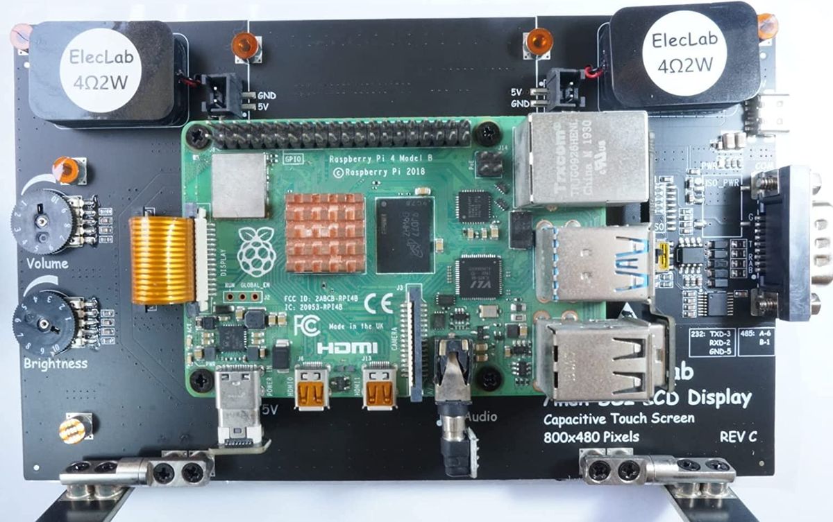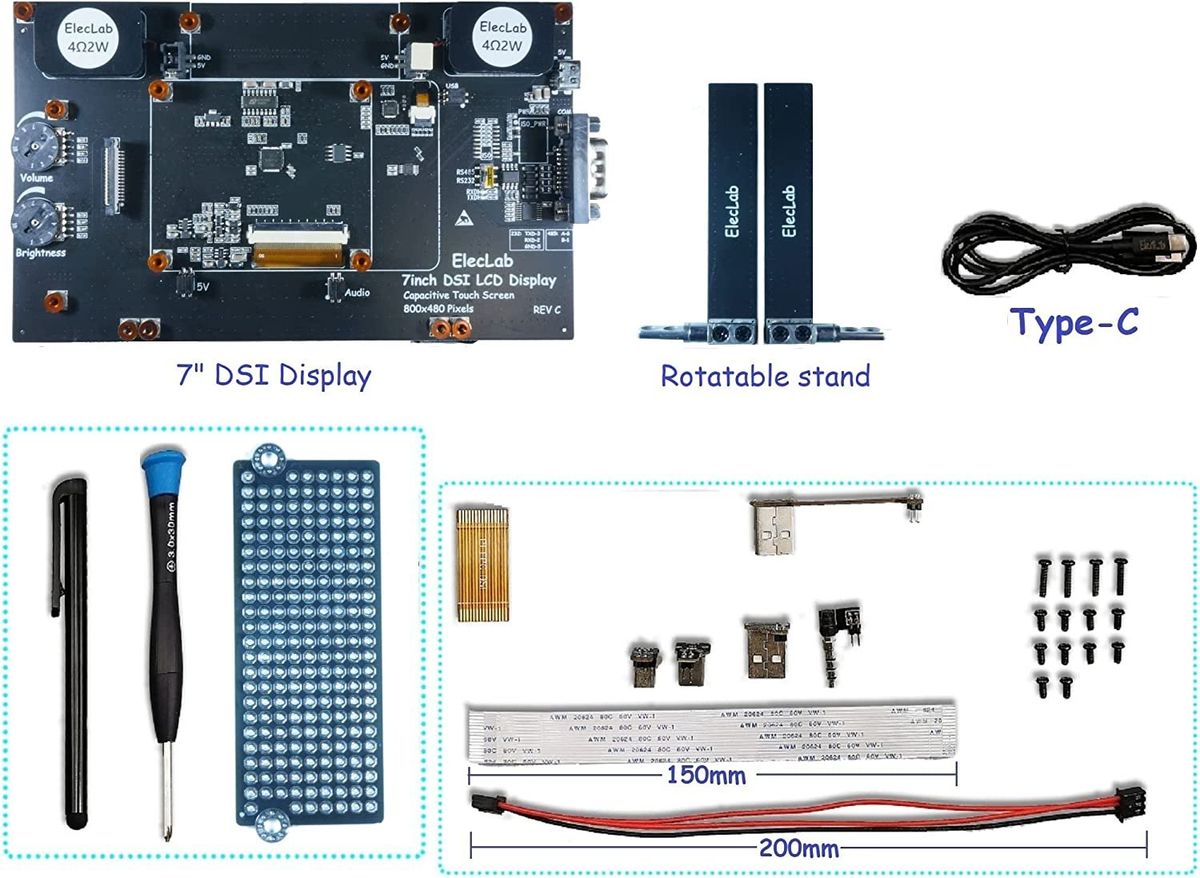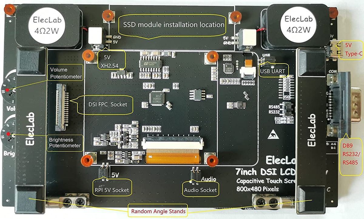 - DSI interface 7-inch LCD 800x480 resolution and 5-point capacitive touch screen, display brightness can be adjusted by potentiometer and software PWM, integrated audio amplifier and 2W dual channel stereo speakers and volume potentiometer.