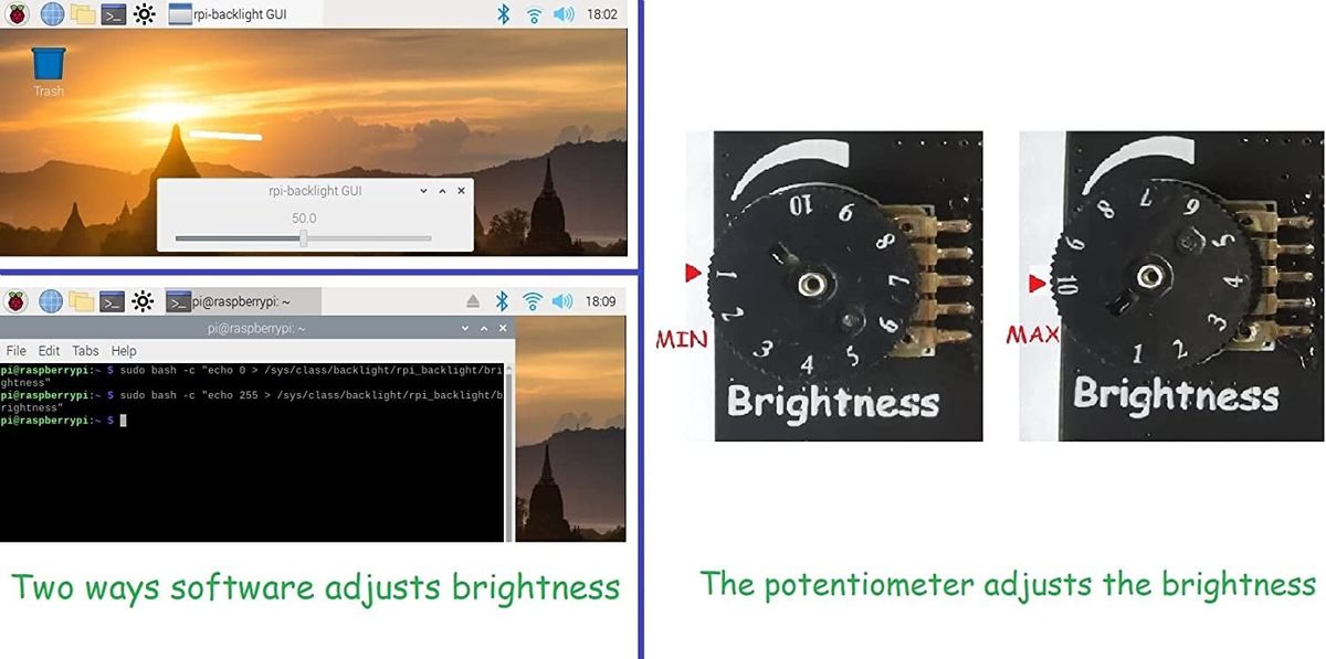 3. Brightness can be adjusted by installing rpi-backlight, or using the following command line: