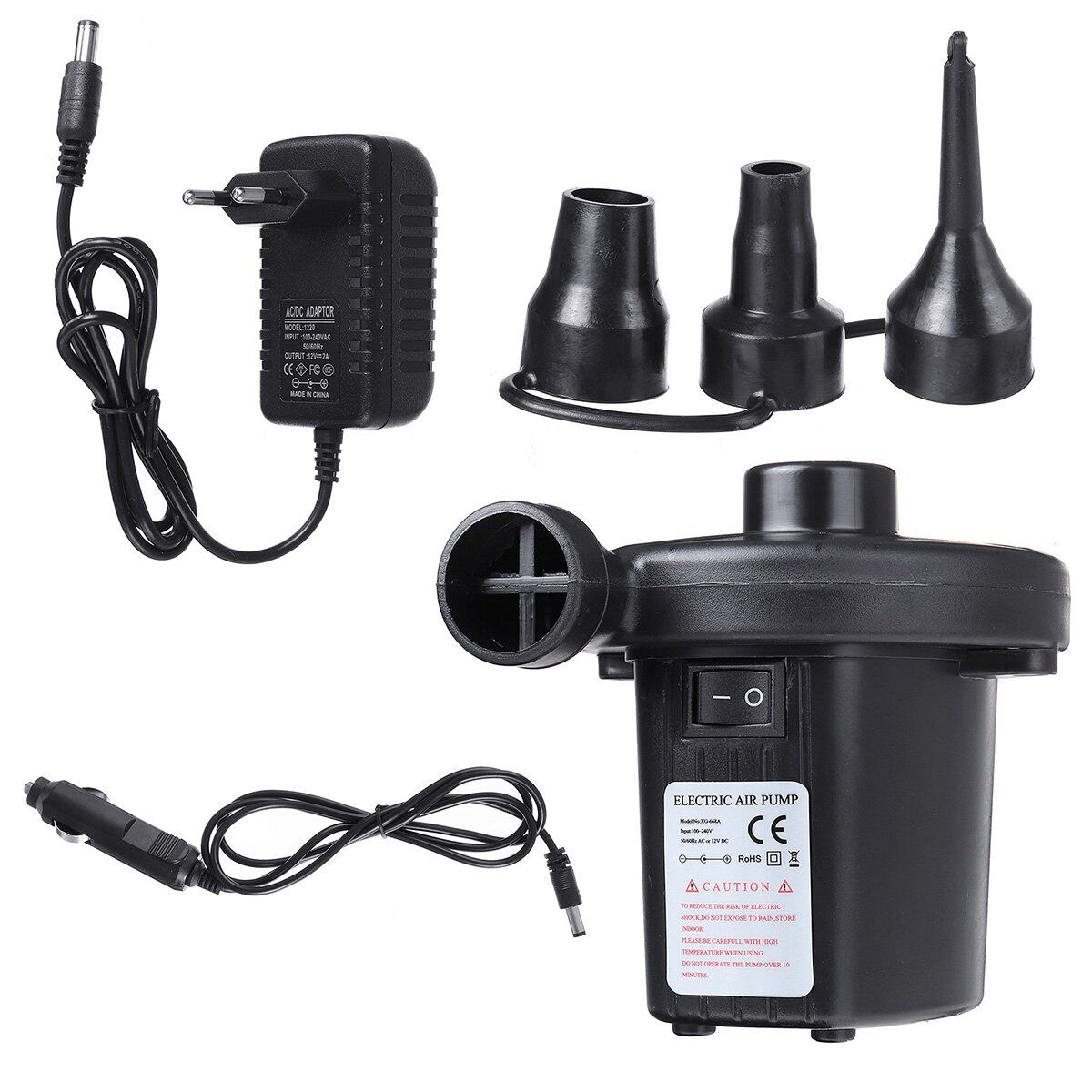 1 x Electric Air Pump 1 x Pump Nozzle (3-IN-1) 1 x Car Cigar 1 x Adapter