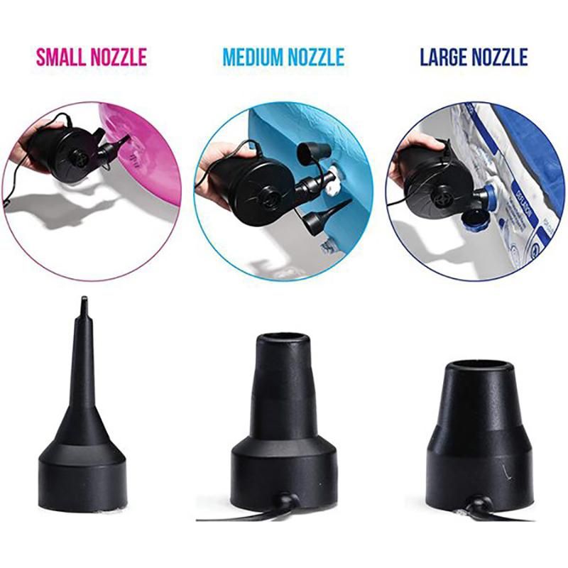 [3 different sizes of nozzles can meet different needs] S size nozzles-suitable for small inflatable toys or swimming rings. M size nozzle-suitable for small hole inflatable bed, inflatable swimming pool or seat. L size nozzle-used for inflatable air cushion, inflatable swimming pool or boat.