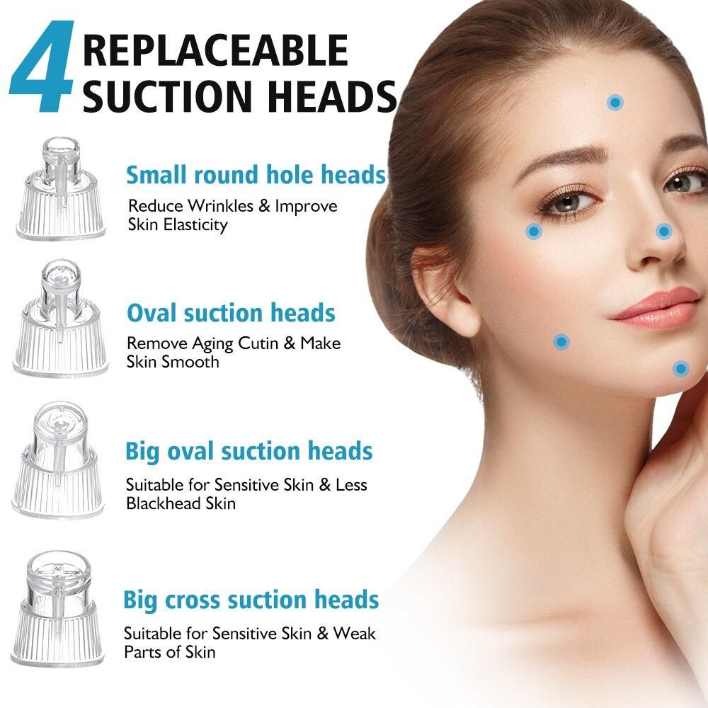 2.Four different suction head for different areas of the face: A.S-type small suction head, ordinary suction, suitable for t-zone cycle cleaning and maintenance; B.S-type large suction head, strong suction, suitable for large area cleaning; C.Large cross suction head, medium suction, suitable for large area to absorb dead skin and blackheads; D.Small cross suction head, suitable for small area cleaning such as nasal gully.
