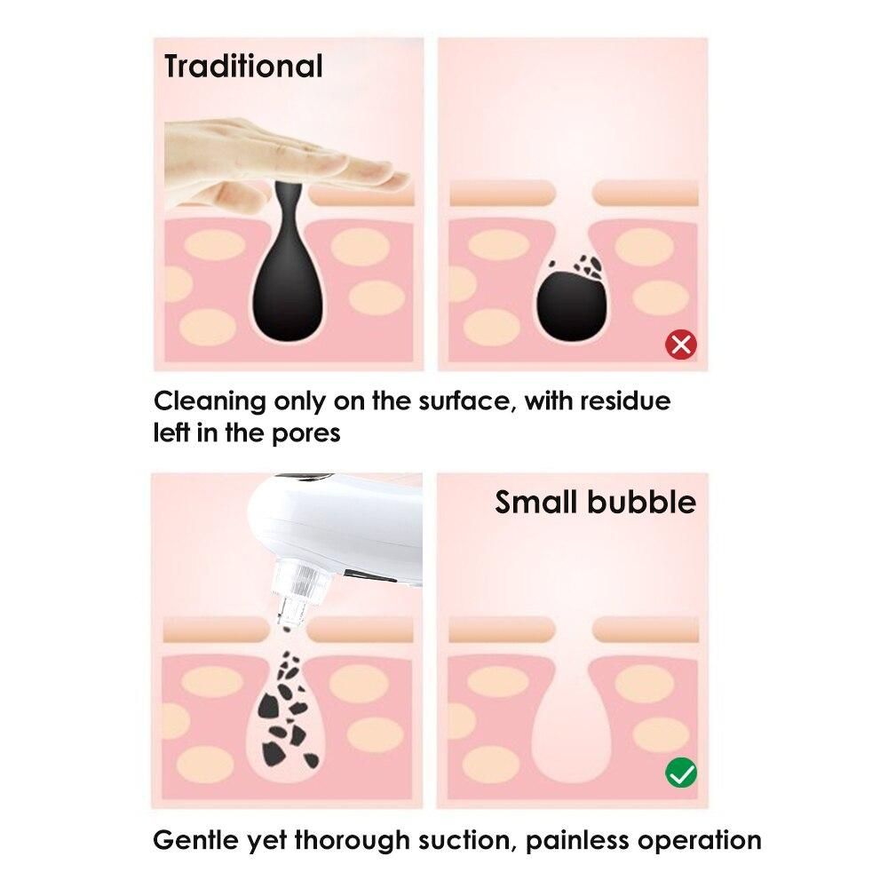 Traditional blackhead absorber can easily result in skin redness and swelling and enlarged pores. The small bubble blackhead remover cleans pores adopts water and oxygen circulation, which is more gentle and does not hurt the skin. It effectively absorbs blackheads, oil, dirt and aged cutin in pores. Meanwhile it can also moisten the hair follicle, clean and maintain skin health at one time.