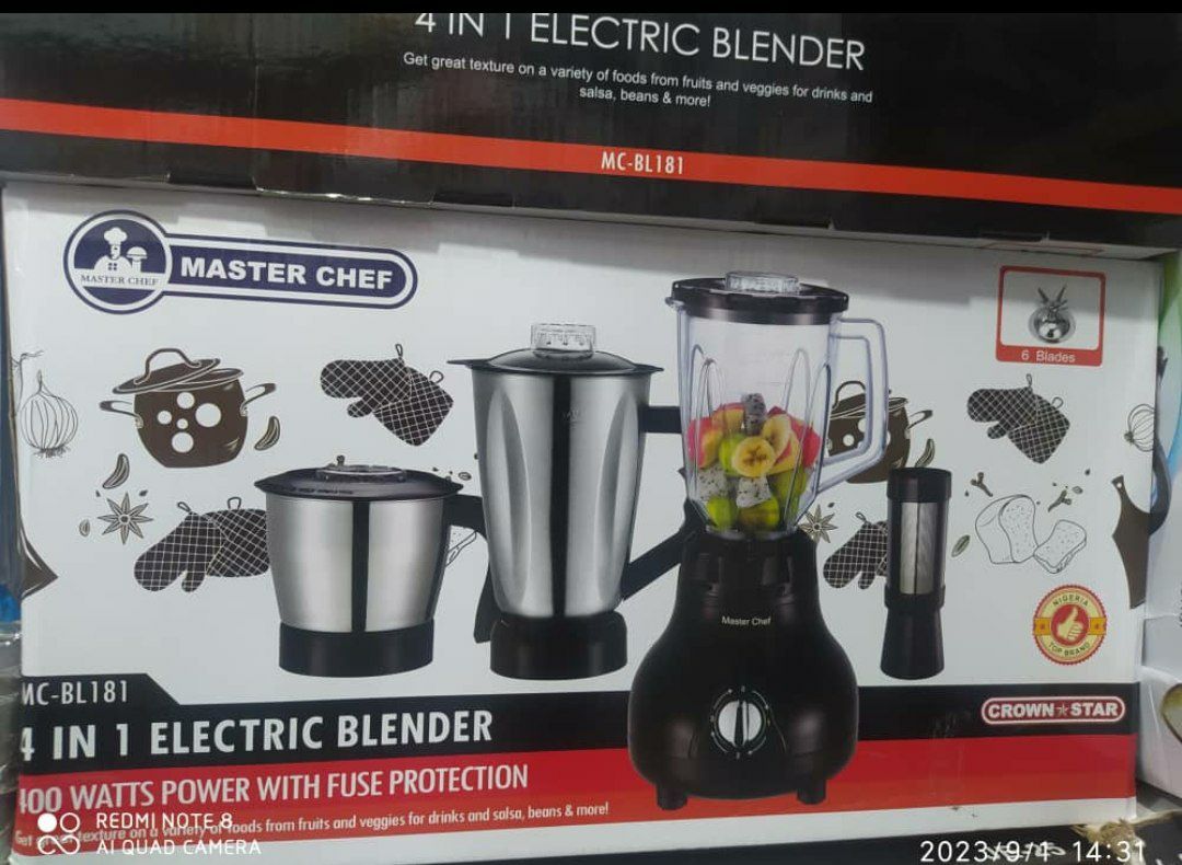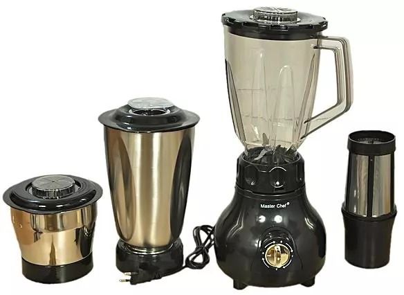 Master Chef Blenders. There's the Master Chef Blender which is designed with large visible measurement marks that allow ease of use. Functions efficiently and effectively with very low noise during usage and you can be sure it is very efficient in power usage. It is easy to use and clean and has an option for quick "pulse" blending