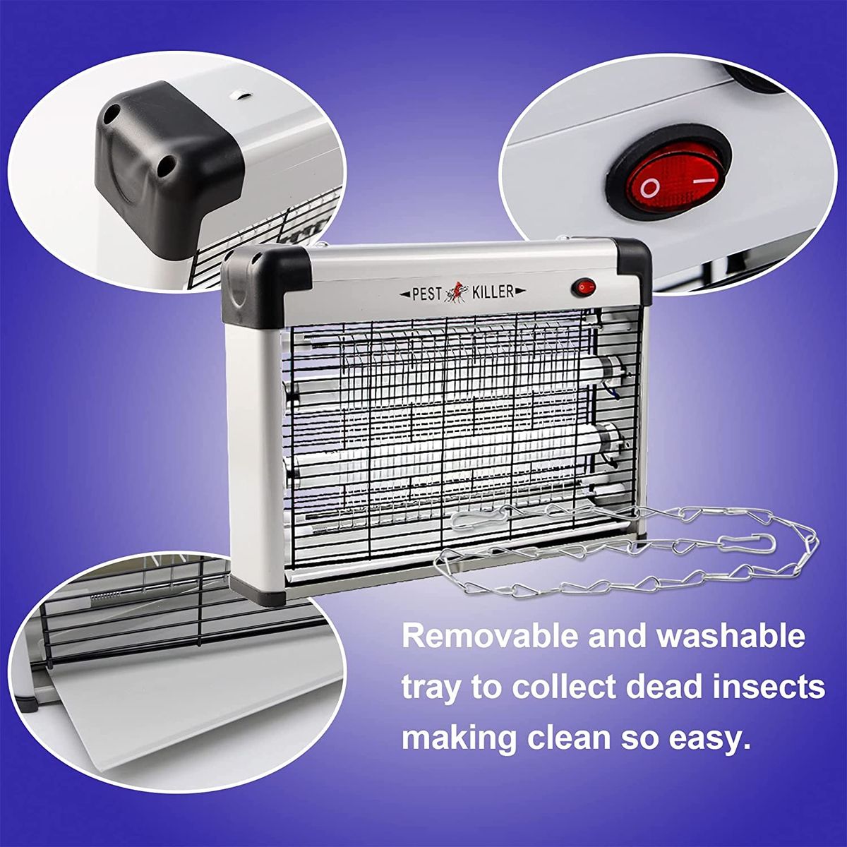 Easy to clean: At the bottom of the zapper, there is a removable and washable tray to collect dead insects making clean so easy. The high voltage mental grid can be cleaned with suitable brush. Please unplug the zapper before cleaning.