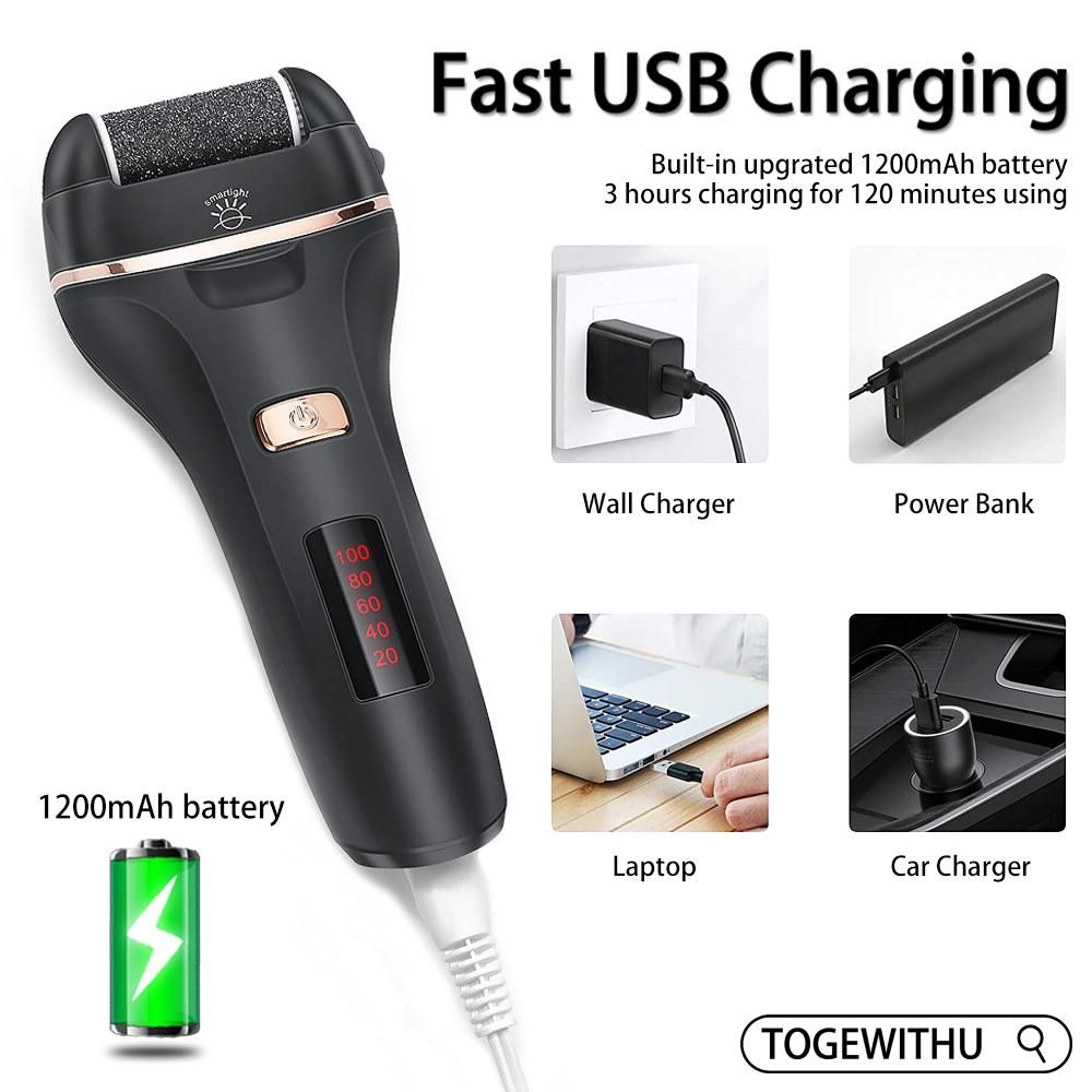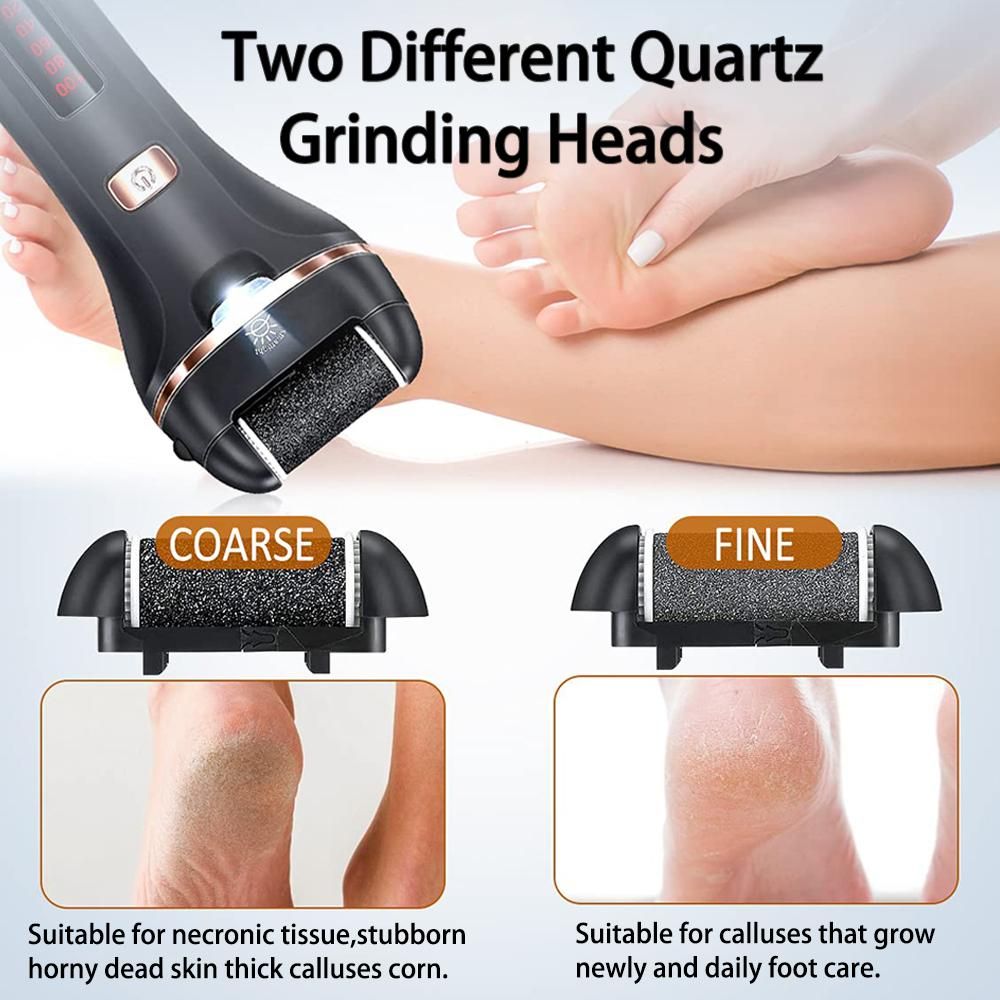 LED Light and 2 different roller heads: LED Light design illuminate difficult angle. We have 1 fine roller head and 1 coarse roller head in this set. Meet all your callus removing needs. Refillable coarse roller head that spins 360 degrees for quick results on thick, calloused skin.