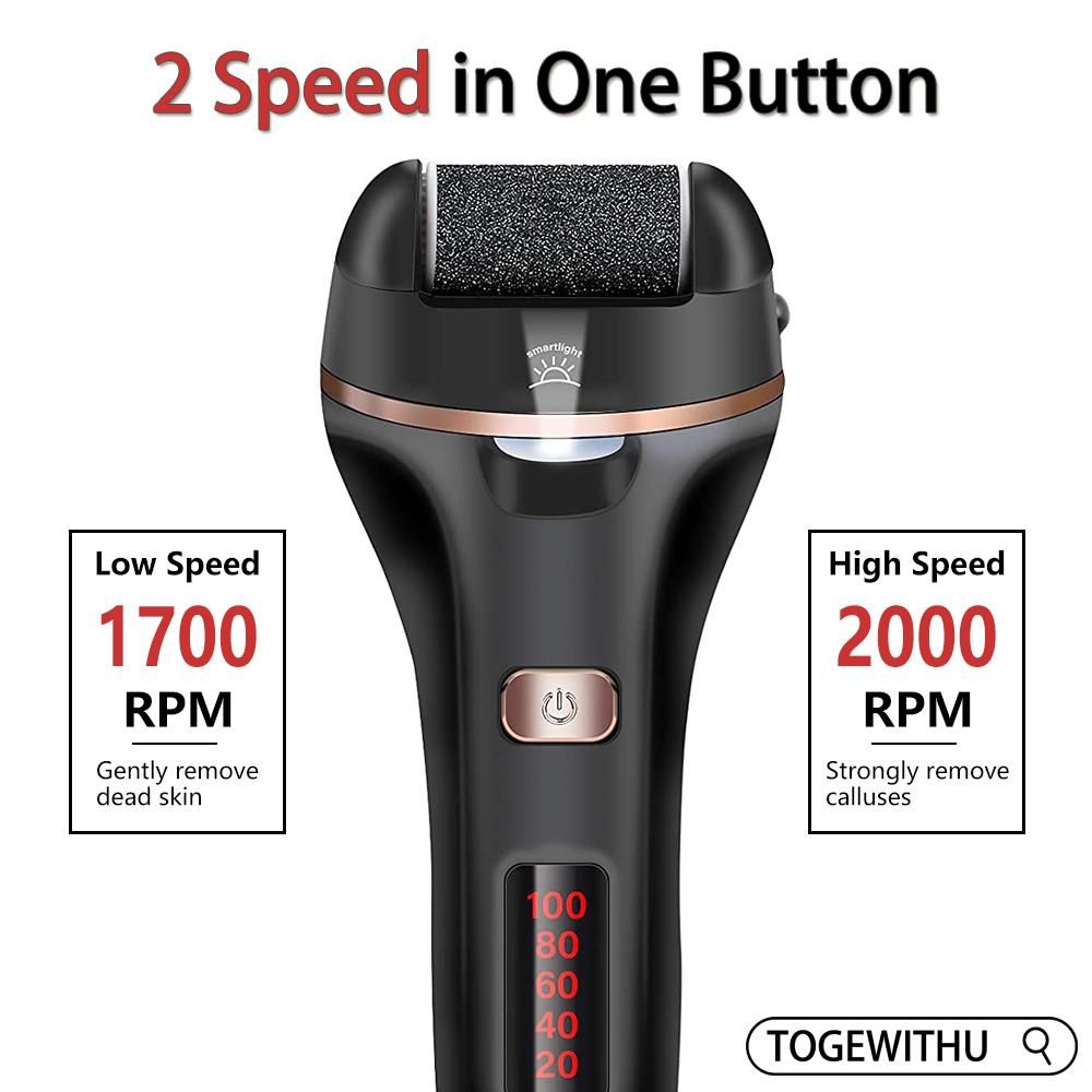 2 Speeds adjustable and safety: 1700x/min when low speed and 2000x/min when high speed. Low speed is suitable for the callus of hands and more delicate skin care. High speed is suitable for stubborn thick callus and dead skin. You are free to choose the speed you need! If the pressure is too strong,it will automatically stop working and avoid damage to the healthy skin.