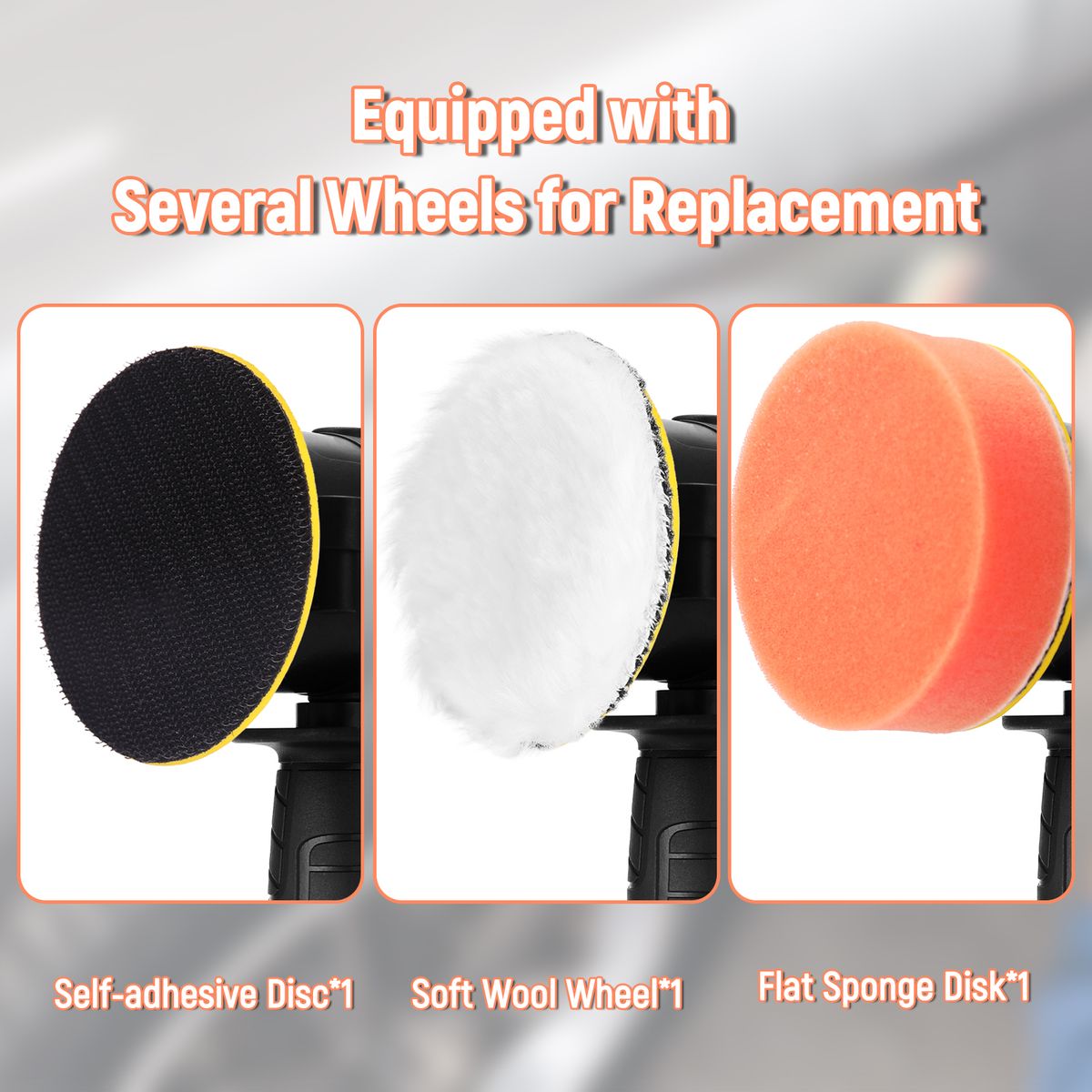 With the accessories and one flat sponge plate and a soft wool wheel, also has a wrench, you can change them for different needs.