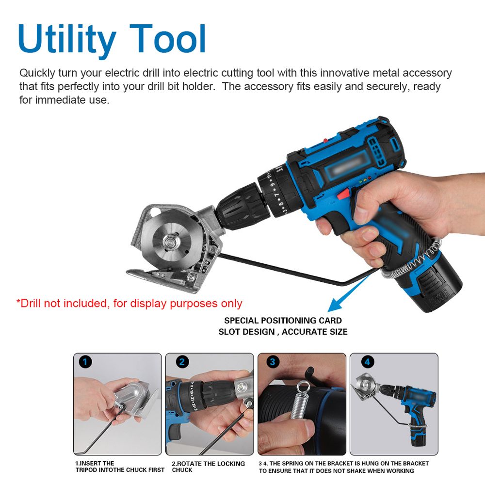 【Utility Tool】: Quickly turn your electric drill into electric cutting tool with this innovative metal accessory that fits perfectly into your drill bit holder. The accessory fits easily and securely, ready for immediate use.