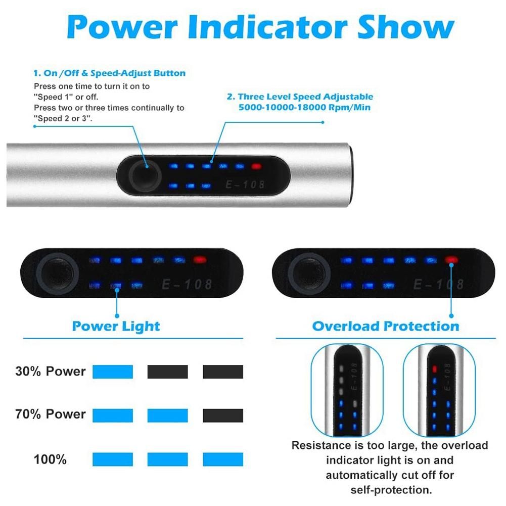 Unique Design, Overload Protection: This DIY electric engraving pen is equipped with a power indicator, speed indicator, and overload indicator, which can know the usage of the engraving pen in real-time, and you can adjust the working speed you want according to different usage conditions. When the resistance is too large, the overload indicator light is on, and the power supply is automatically cut off for self-protection, avoiding damage to the motor and prolonging the service life.