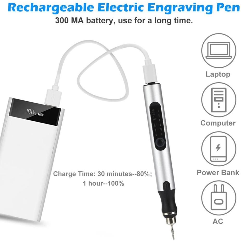 USB Charging Wireless Engraving: Our cordless engraving pen can be used with recharge or connected to a power source and is equipped with a Type-C charging cable for easy and fast charging. 30 minutes can charge to 80%, 1 hour to fully charge; Long-lasting battery used continuously for 1 hour under normal conditions.