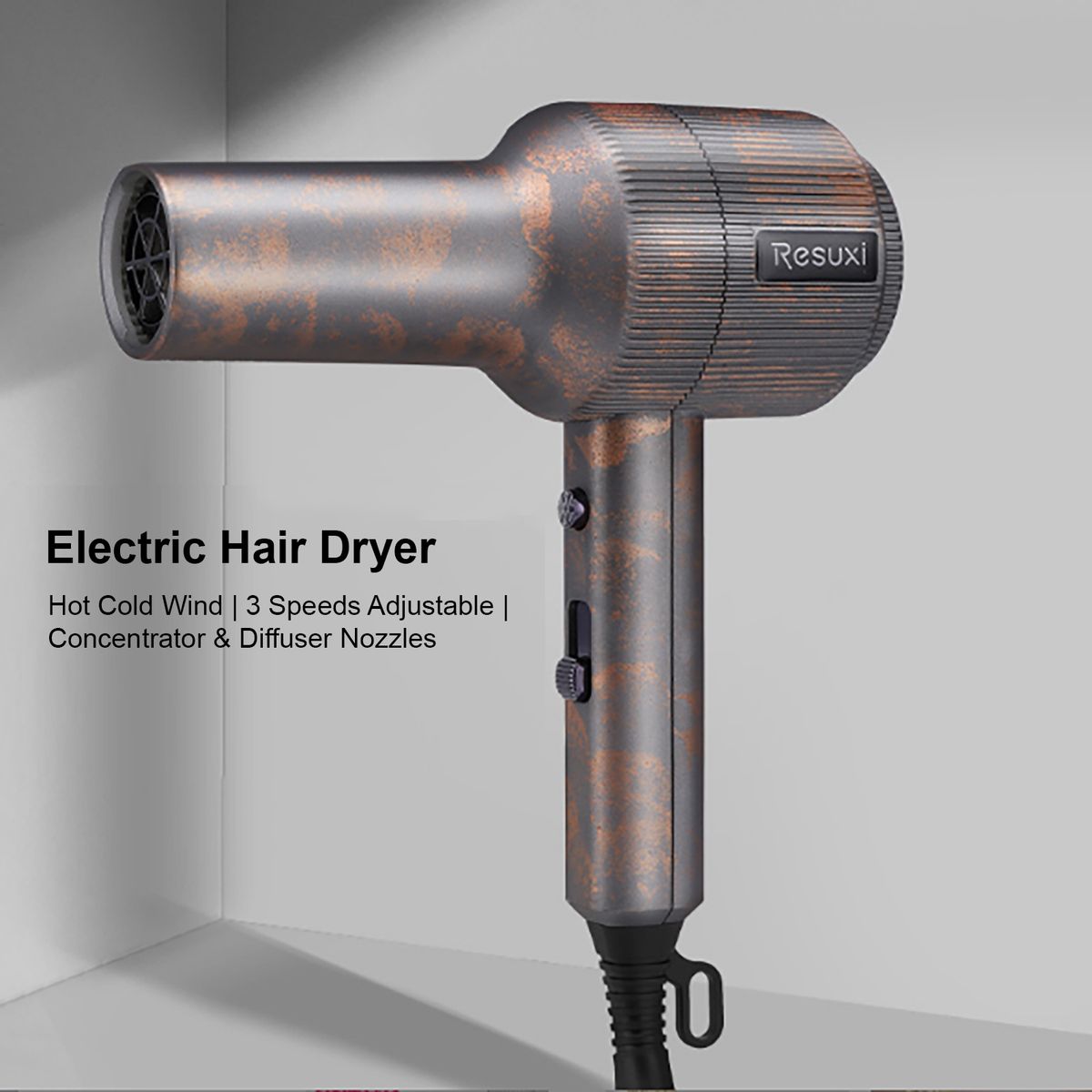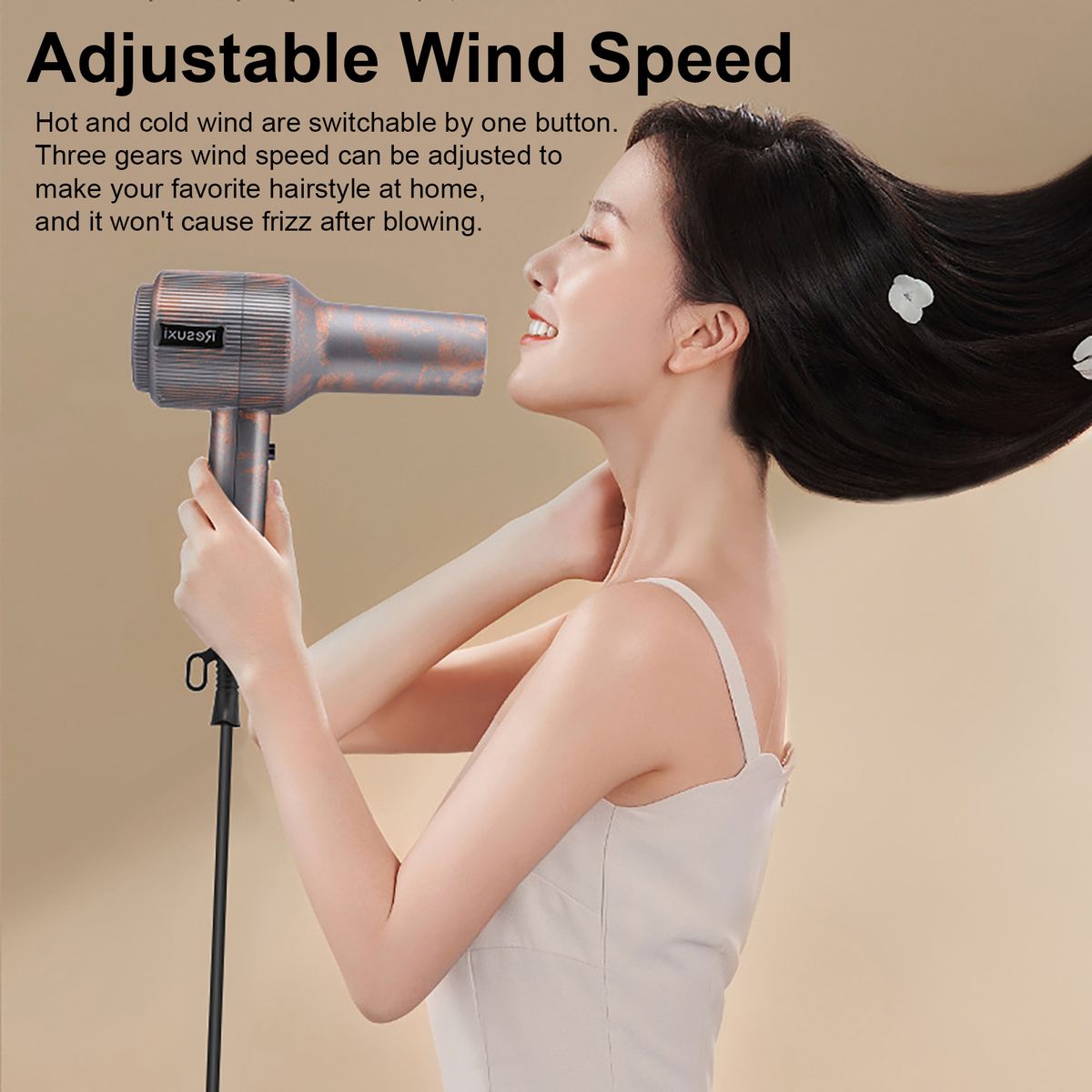 Hot and cold wind are switchable by one button. Three gears wind speed can be adjusted to make your favorite hairstyle at home, and it won\'t cause frizz after blowing.