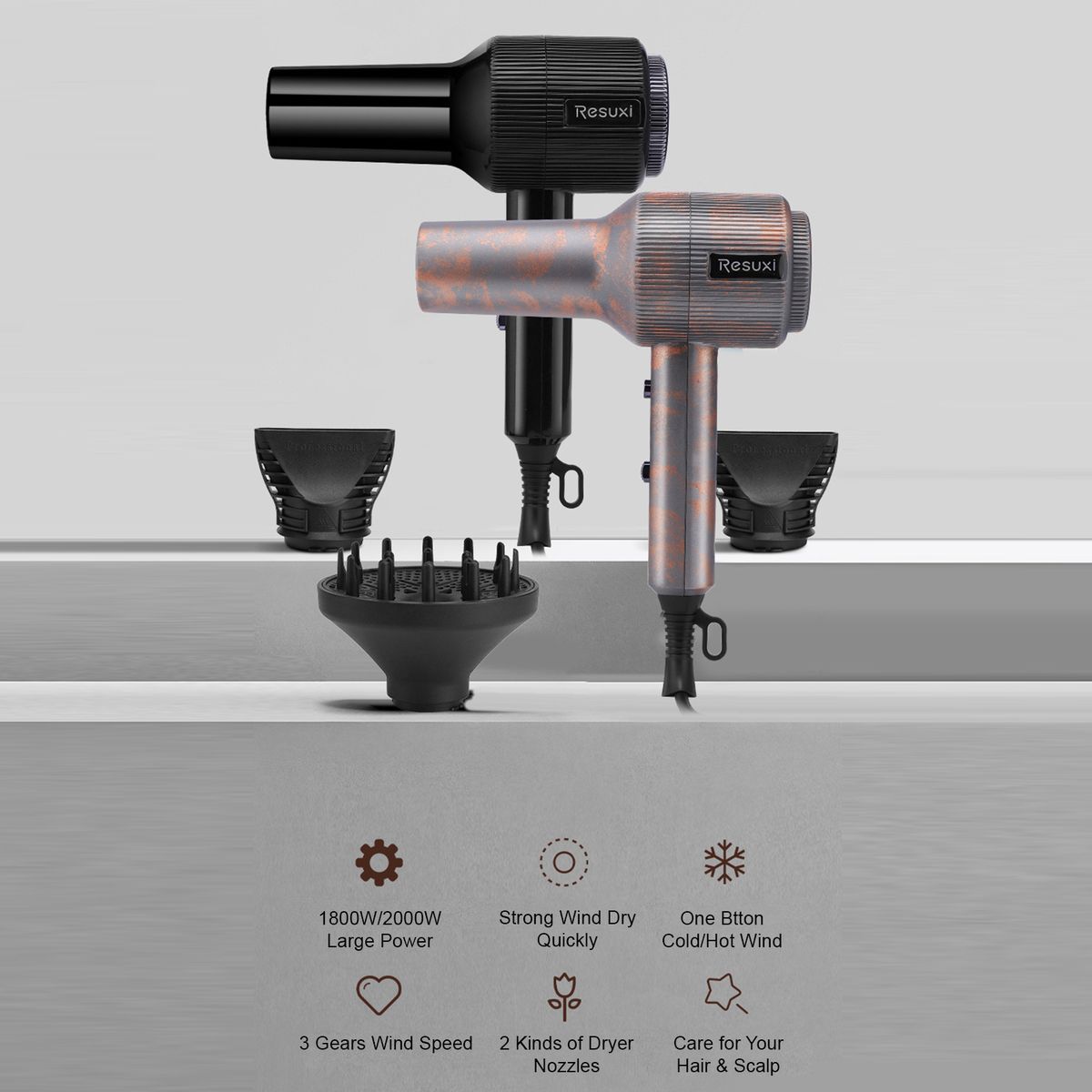 This hair dryer has a 1800W(US) upgraded AC motor, powerful but low noise, helping you fast and gentle dry hair, care for hair and scalp.