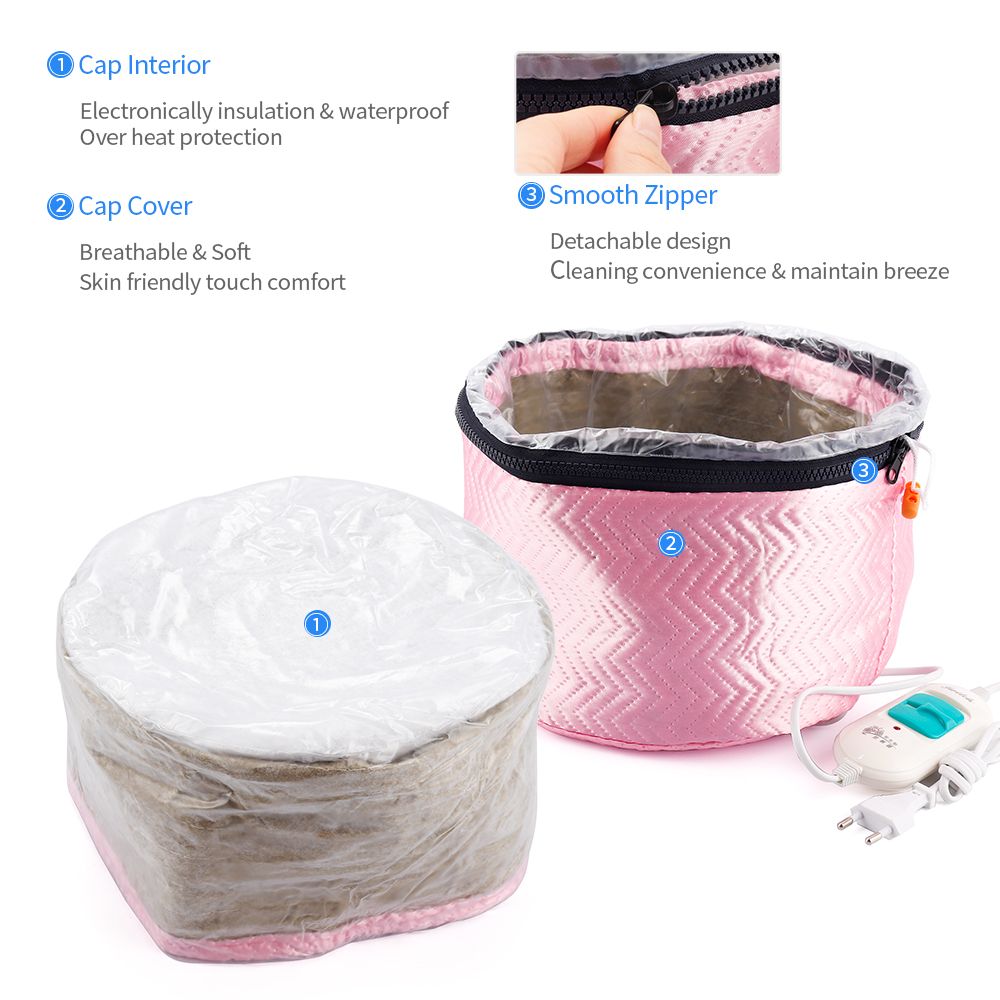 Heating up quickly. Uniform and exquisite double-layer circular wire, fast heating, more easily absorbed nutrient film. One on control design, you can easily slide the on to power on/off and switch the temperature modes, user friendly and convenient. Waterproof inner embedded plastic film can maintain better moisture keeping effect and steaming performance to improve hair split ends and repair hair damage, effortlely helping regain your silky smooth hair. When heated, there is no plastic smell and paste taste, safe and healthy. Quick-to-release drawstring can freely adjust the cap closure to secure fit your head with perfect tightne. Detachable and smooth zipper design allows for cleaning convenience and maintain breeze, Suitable for both home and travel use, you can instantly acce hair nursing whenever and wherever you want