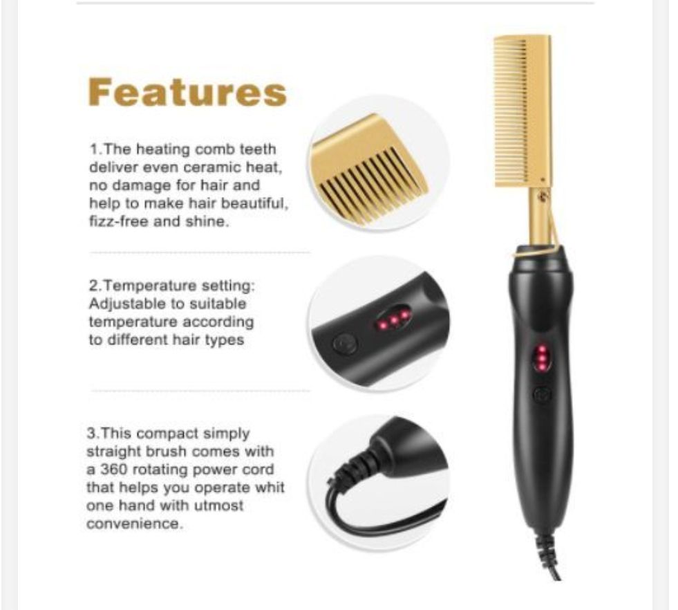 Hot Comb Electric Heating Hair Straightener/Hair Curlier. Hair Straightener Comb【Easy to Use and Safe】: Hot Comb One-button operation design, easy to use. Besides, This electric hot comb with a unique anti-scald comb for you, so don't need to worry scalp hurt during use caused by uncertain temperature. Clean the Scalp: The soft head teeth protect the scalp while preventing tearing or pulling of the hair.【Extra Fast Heating Time】:This Hair Electric Brush straightener brush Heat-Up just in 30 seconds with PTC comb; Easily adjust the temperature to suit your hair type and quickly providing you with a salon-quality.30 second heat up makes this the perfect heat press comb for everyone. The high heat retention provides for even heat conditions hair making it shinier, silkier and frizz-free.【Suitable for All Hair Types Ceramic Heat: The heated comb transmits uniform ceramic heat without damage to the hair and hair helps to make the hair beautiful, bubble-free and shiny. Adjustable temperature settings(High-end: 160~210℃, suitable for thick and hard hair Mid-range: 120~160℃ suitable for normal hair Low Range: 80~120℃ suitable for soft hair ),besides intelligent heat control to suit your hair type, length, and effect the style as you like.【2 in 1 Functions】:You can not only use this hair straightener brush to curly hair but also straight your hair. High performance ALL-IN-ONE. Swivel Cord: This compact and simple straight brush comes with a 360-degree rotating power cord which helps you operate with all your convenience. The swivel cord makes doing your hair even easier by being tangle-free. Auto-shut off is also included for added safety in case you forgot that you left it on.【EASY TO CARRY】:This Straightener Brush is small and easy to carry everywhere, so you don't have to worry about it taking up space and weight. Make Your own style whenever, wherever and whatever you want