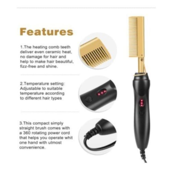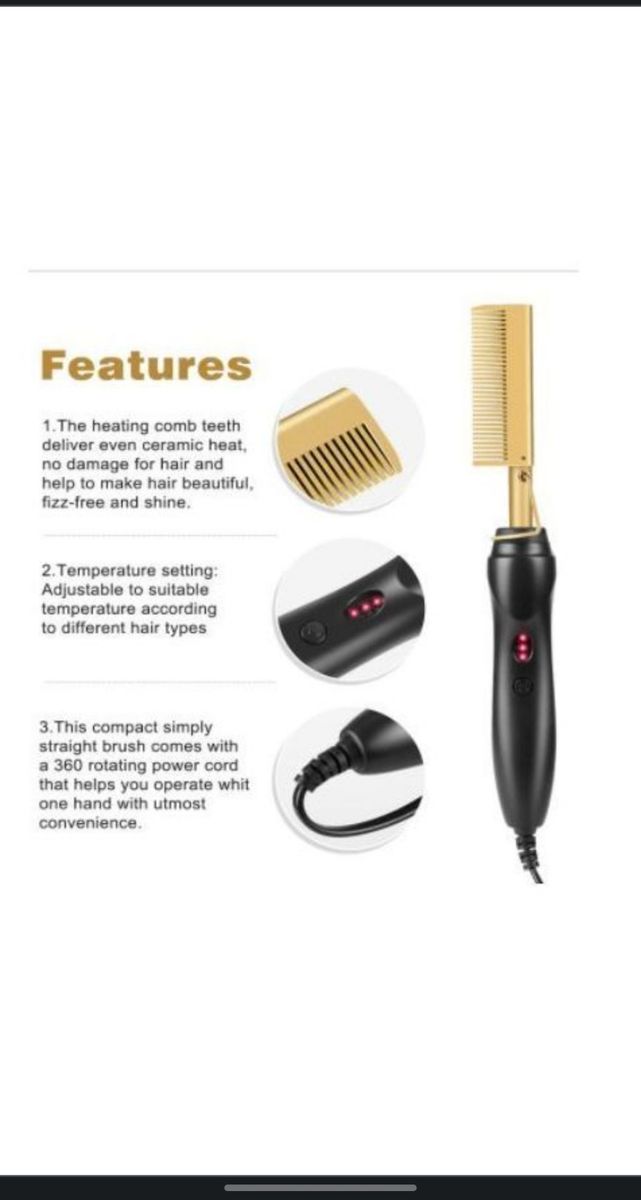 A metal comb that is used to straighten moderate or coarse hair and create a smoother hair texture. A hot comb is heated and used to straighten the hair from the roots. It can be heated by turning on the control button. it is a very good product and can be used by both professional hair stylists, salon owners as well as individuals.it is light weight and can easily be moved around without stress. It is a durable product from a very durable brand bestide - a well known international electronic company in the world. Be assured of a great user experience. It's easy and simple to use and maintain.