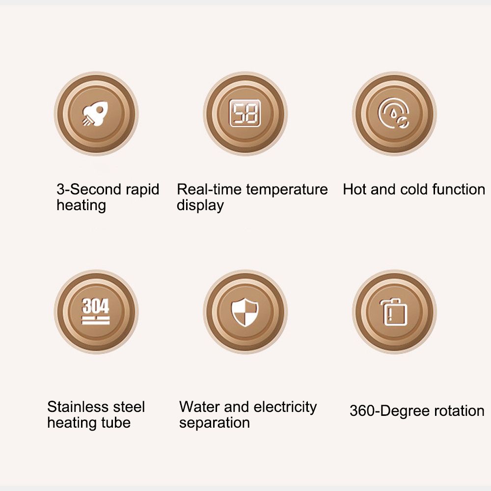 Features: Heating: This electric faucet features a 3-second rapid heating system, providing hot water instantly for your convenience. No water tank for water storage, no need for preheating. LED temperature display, constantly monitoring changes in water temperature, bidding farewell to the era of manually testing water temperature.
