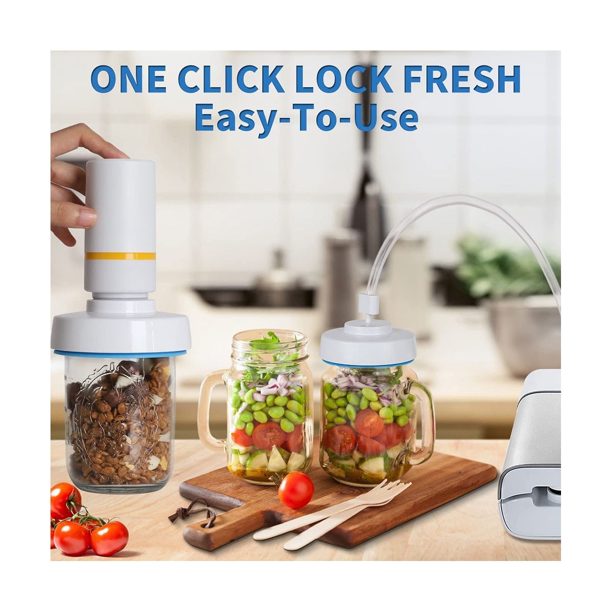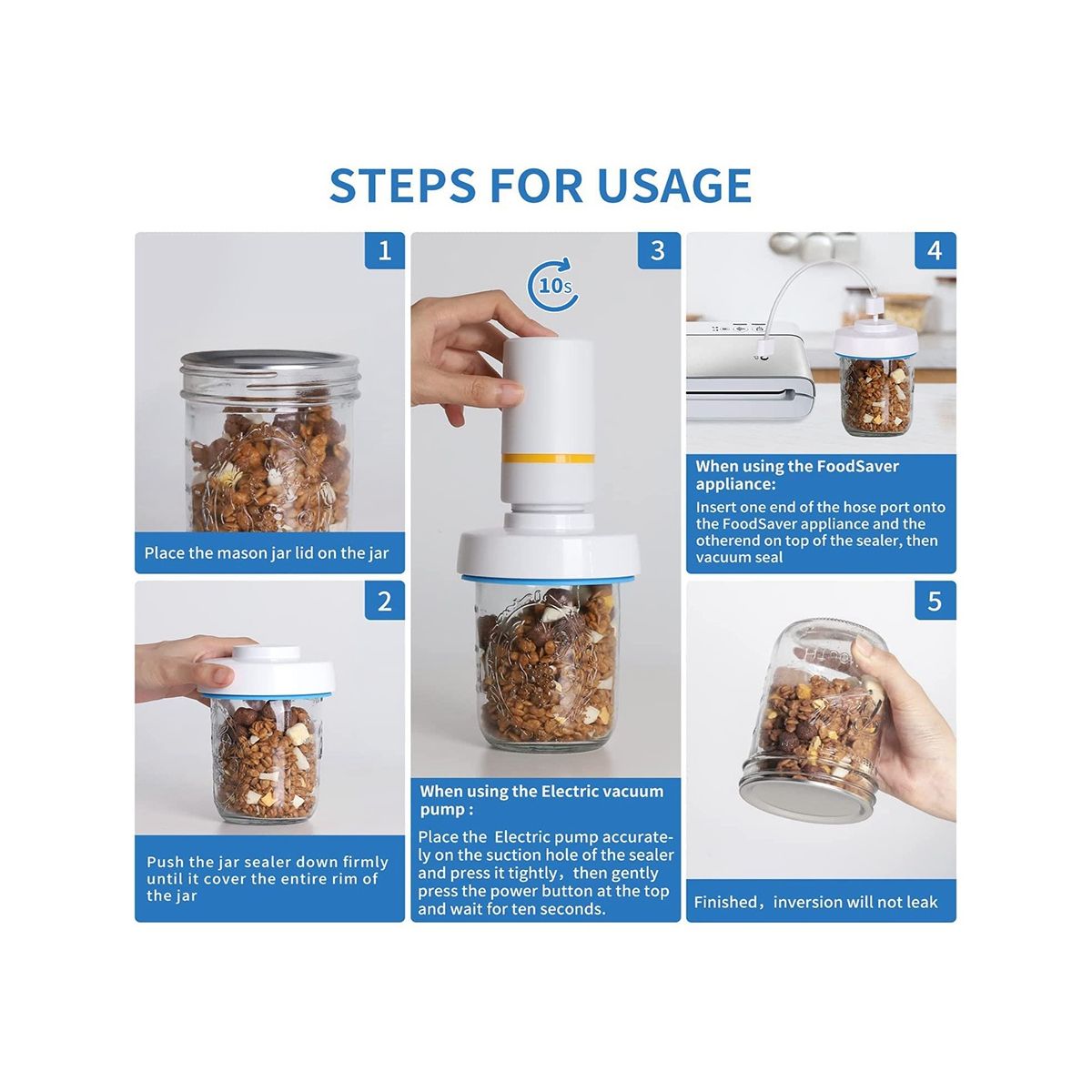 THE ONLY VACUUM SEALING KIT YOU'LL EVER NEED - Your Food Vacuum Sealer Kit comes with all the tools necessary for an enjoyable sealing experience. The following pieces are included: (1x) Wide-mouth sealer lid, (1x) Regular-mouth sealer lid, (1x) -Seal Vacuum Pump, (4x) Wide-mouth jar lids, (4x) Regular jar lids, (1x) USB to -USB charging cable (1x) Connector Hose, (1x) -Seal Users Manual. Colour:White