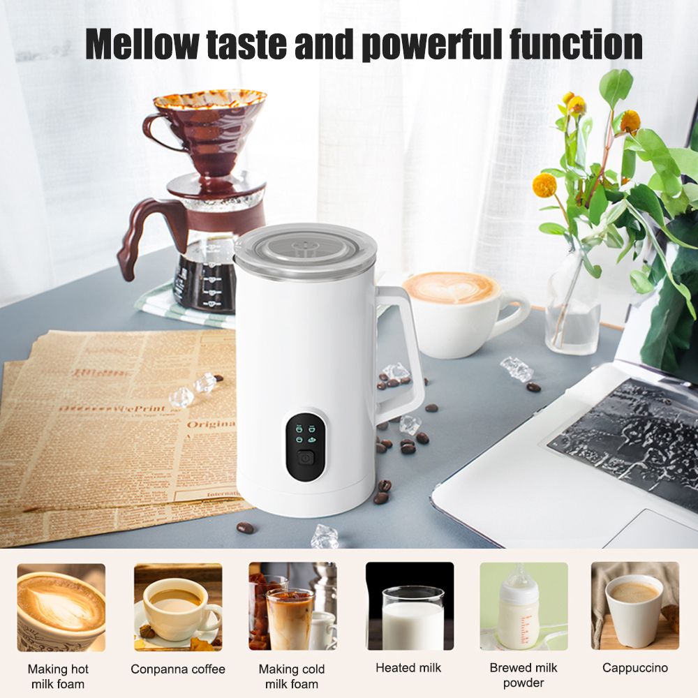 4-in-1 Function: This milk frother offers four different functions, including heating frothing in 60±5°C/140±41°F, cold frothing in room temperature, stirring heating in 60±5°C/140±41°F, and heating chocolate in 70±5°C/158±41°F. It provides versatility for various beverage preferences.