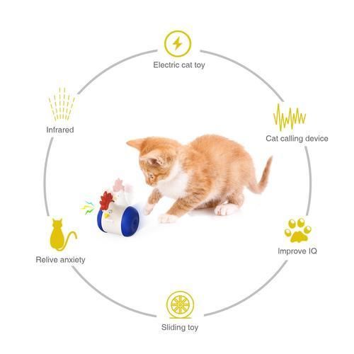 This product is a multifunctional electric cat toy, which integrates multiple functions such as infrared light, squeaking, cat calling, self-weight balance movement, swing forward and backward etc, which can effectively attract cat's interest of playing.