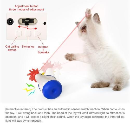 The product has an automatic sensor switch function. When cat touches the toy, it will swing back and forth. The head of the toy will emit infrared light, to attract cat's attention, and it will create a slight chick sound. When the toy stops swinging, the infrared cat light will stop synchronously.