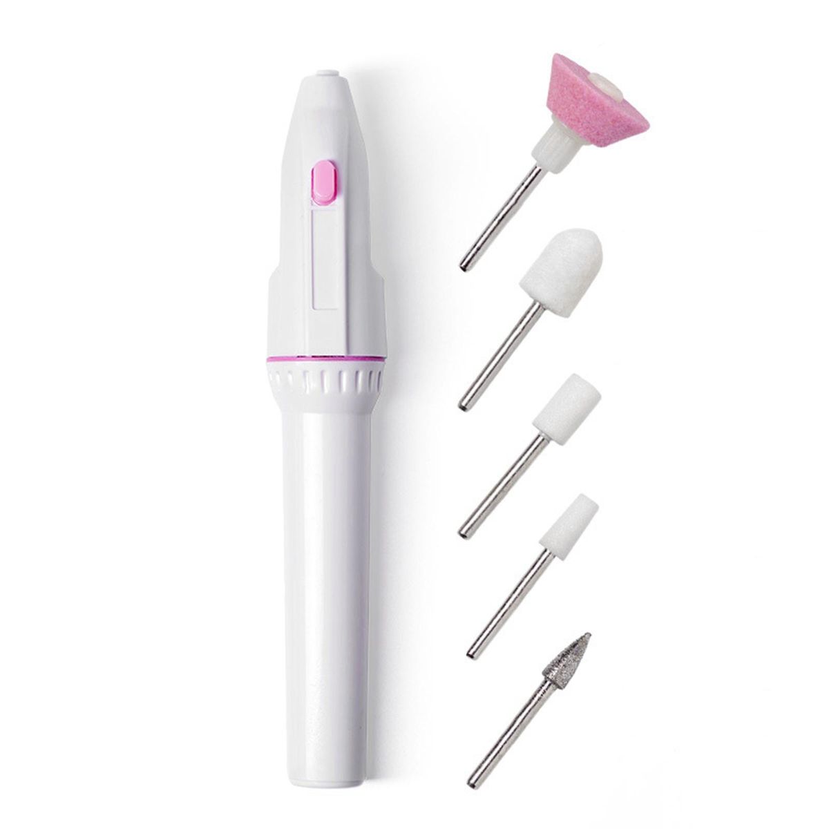Battery pen type grinder, can be used for grinding, carving, , polishing, and remove acrylic , nails, and nail decorationThis electric nail file kit including 5 replaceable heads, each nail drill bit has different functions to remove excess cuticles, grinding, shape buff and shine nailsWith a purple satin pouch, compact and lightweight design, easy to carry for travel holiday,without batteryLightweight metal bits and excellent sanding bands make low noise and slight vibration for smooth and long-time operationIt is suitable for both home, salon and beauty school use