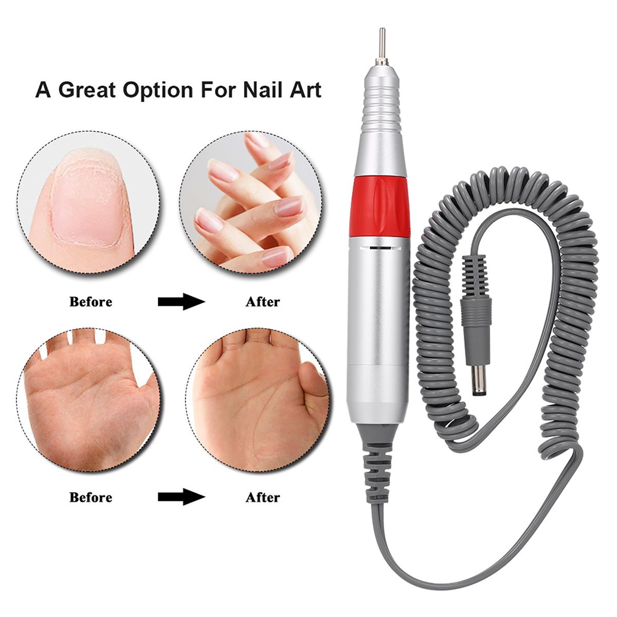 Description:This electric nail drill pen is suitable for nail drill machine which has connector and the rotating speed is 30000RPM. A nice option for home use and salon use.