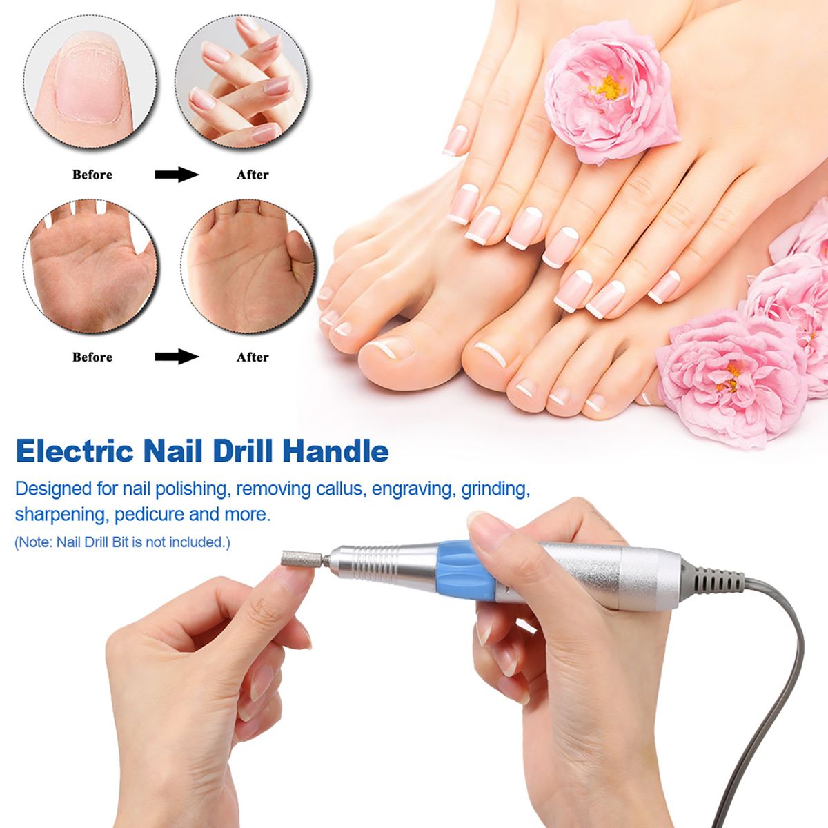 Easy to change drill bits. Designed for nail polishing, callus removing, engraving, grinding and more.