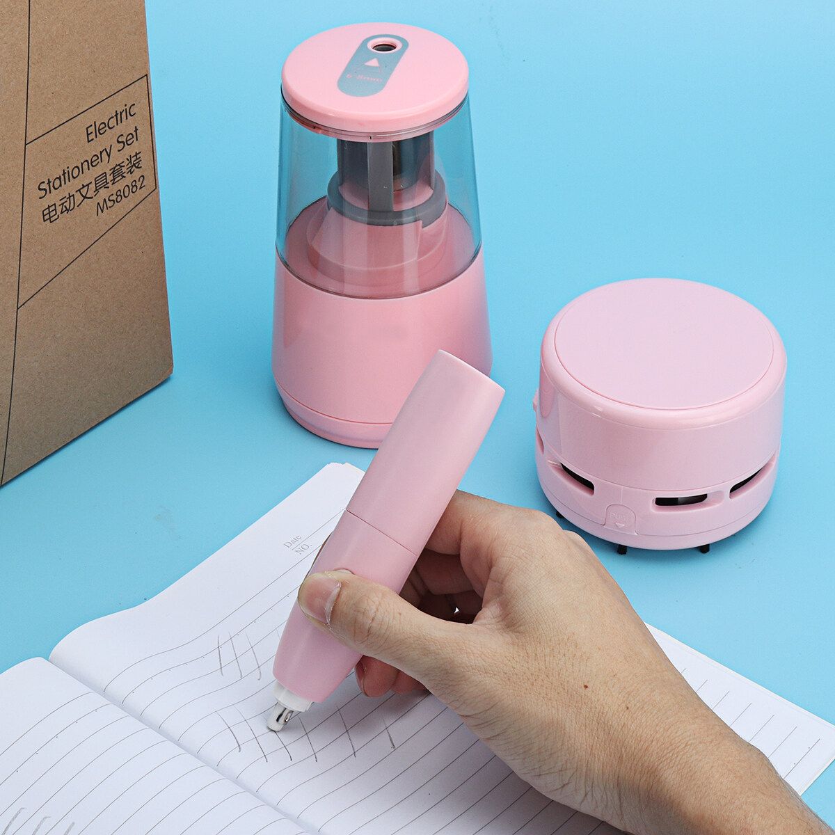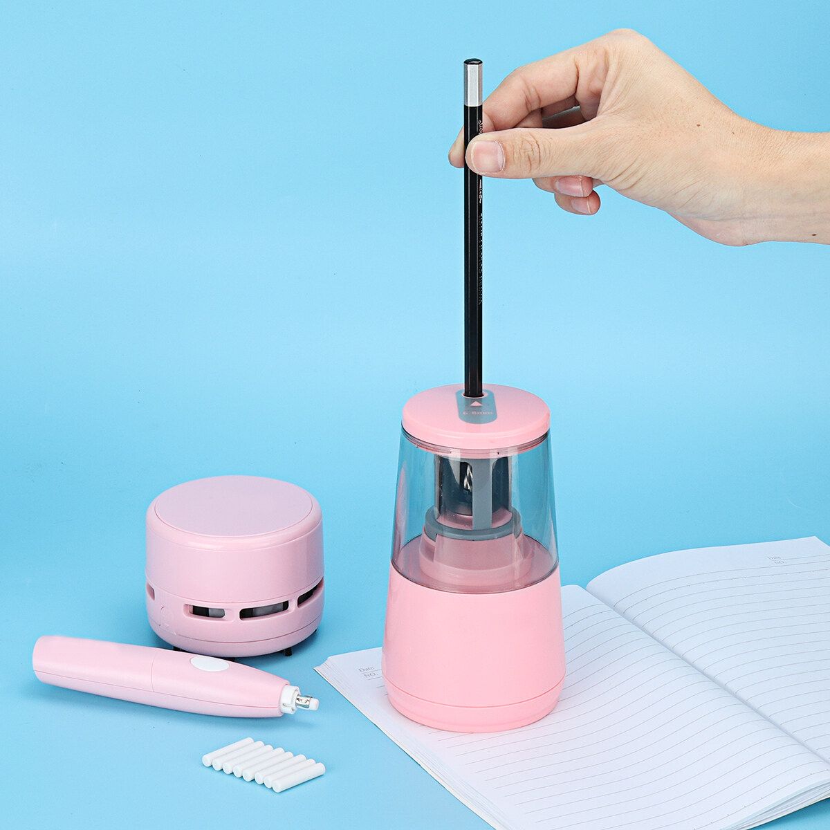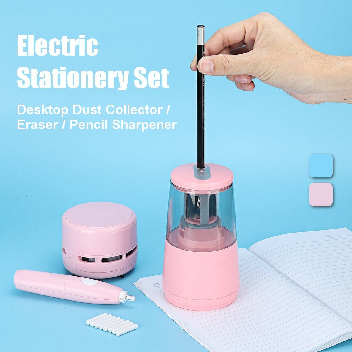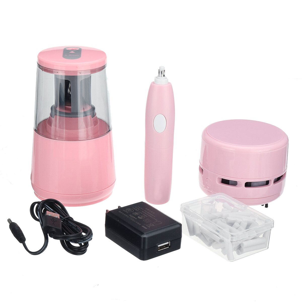 Package Included: 1 x Desktop Electric Dust Collector 1 x Electric Eraser 1 x Electric Pencil 1 x Box of Rubber(70pcs) 1 x AC Adapter 1 x USB Cable 1 x English User Manual (excluding decorations)