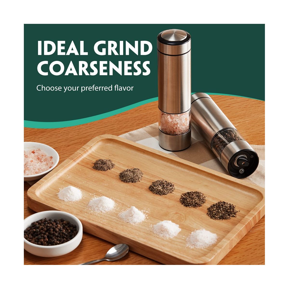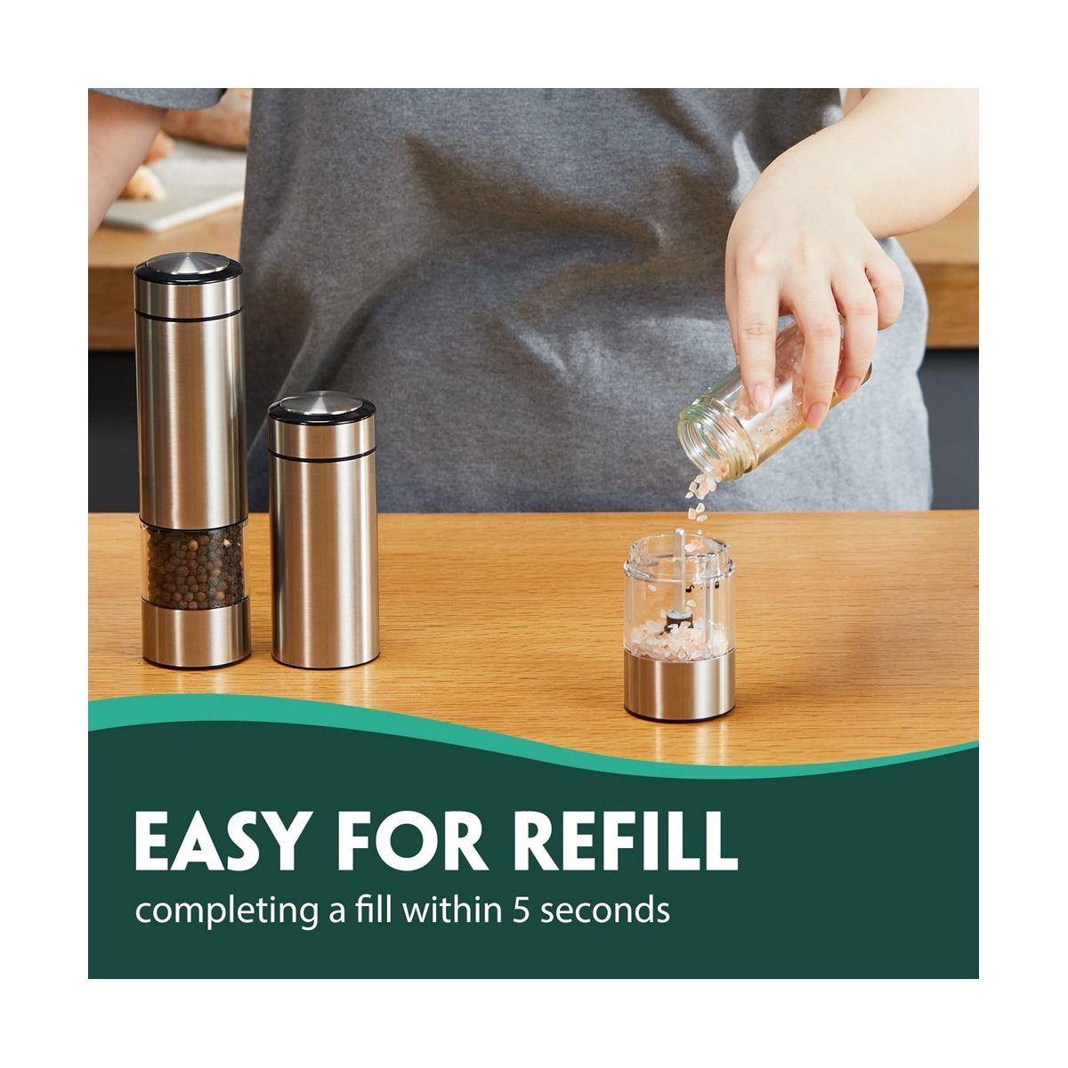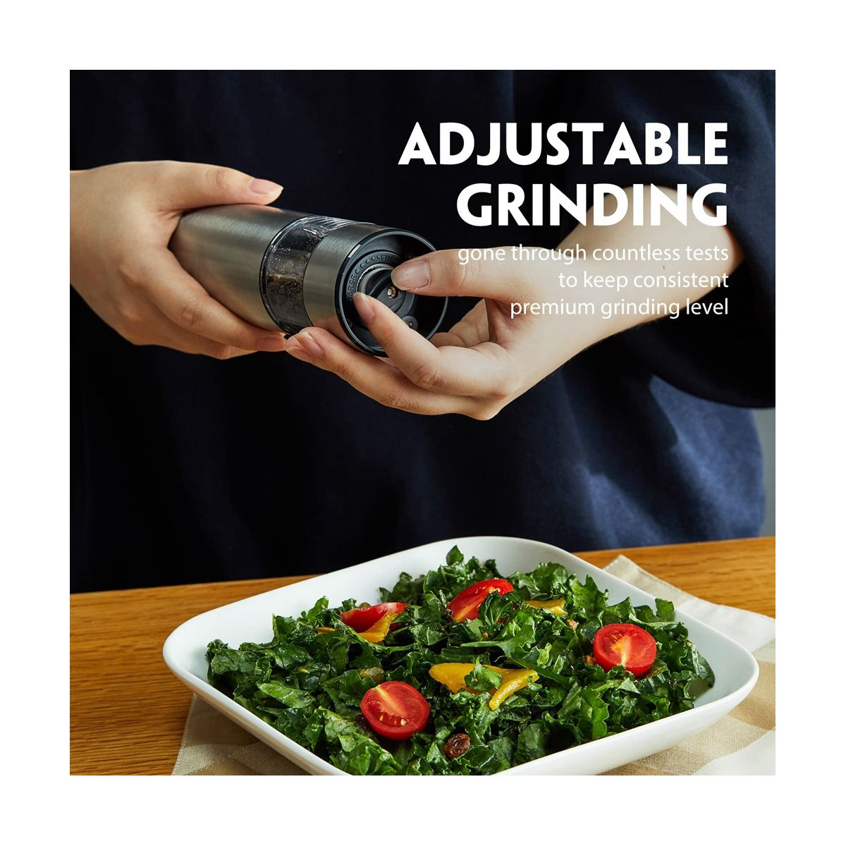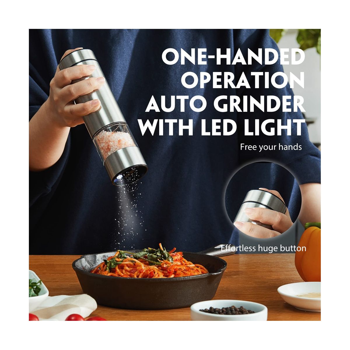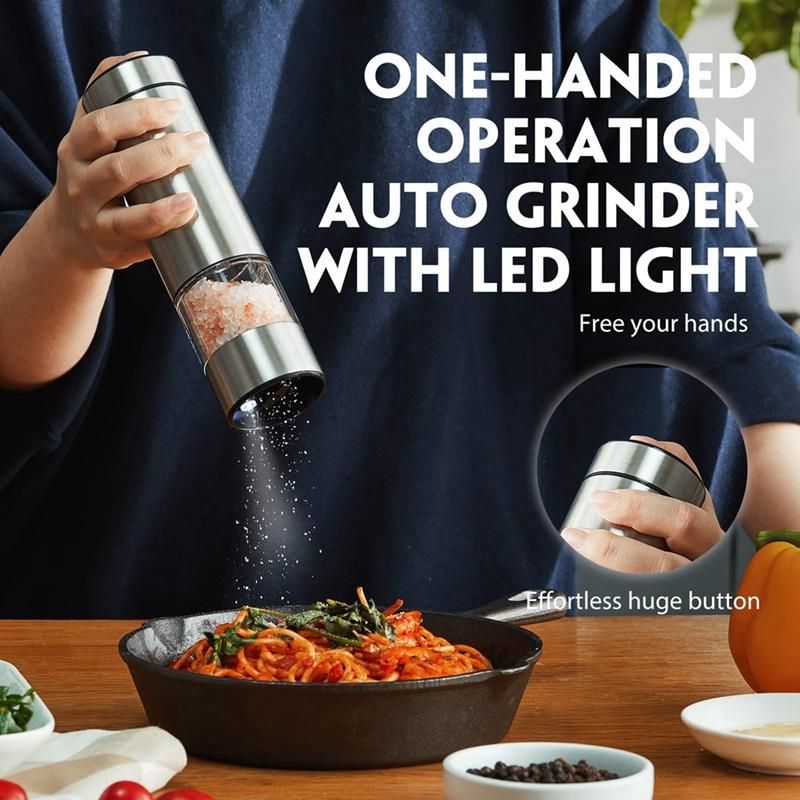 Free your hands With the new-upgraded automatic pepper grinder you can take control of your grinding schedule with just one hand Whether you're tossing a salad or frying a steak or talking to a phone electric pepper and salt grinder keeps you out of a hurry The oversized ons also allow you to save more effort without worrying about low strength or painful hand ailments And the smart unlock setting helps you disassemble for cleaning and refilling