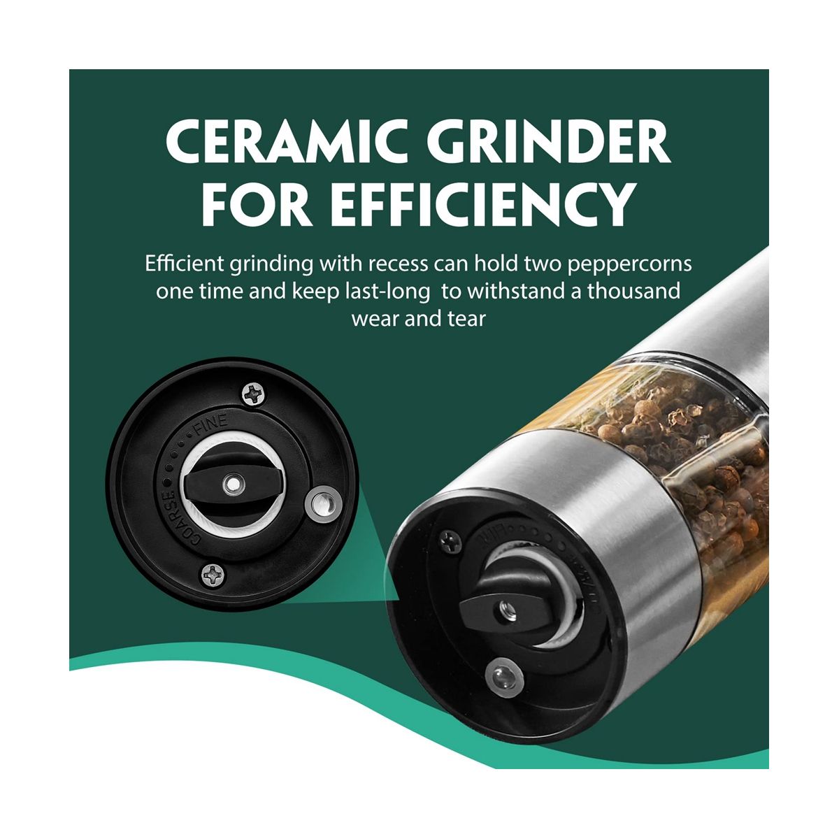 Safety comes first electric pepper is crafted from stainless steelin food grade sturdy and impact-proof storage cabin and inorganic ceramic core without inch of the material of the salt grinder meets food is safe while keeping spices in the electric salt grinder dry from losing flavor